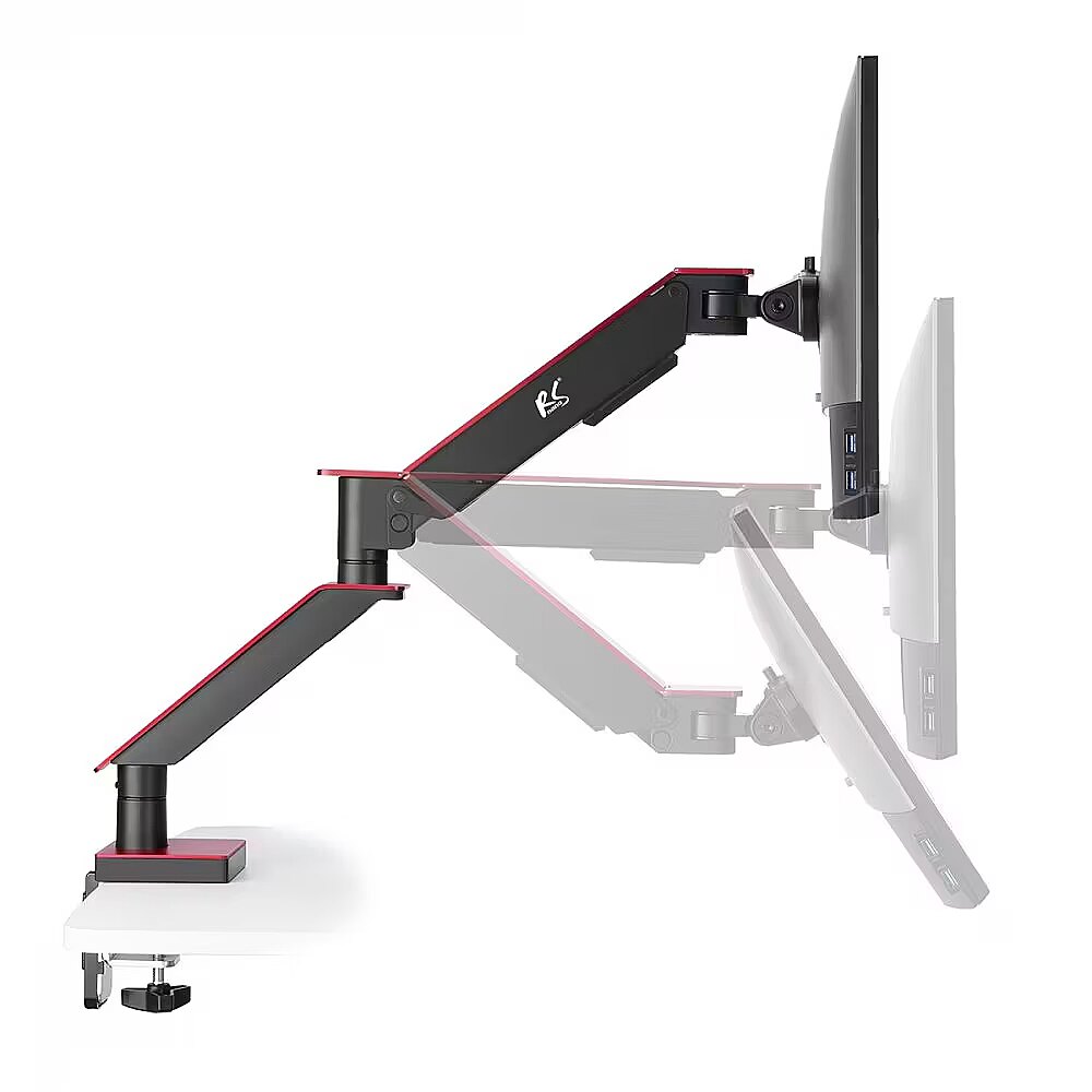 Description - Gaming handle for NanoRS LCD monitor, 17-32", 8kg, vesa 75x75 and 100x100, double arm, RS162 NanoRS RS162 The holder is designed for monitors from 17" to 32", with a maximum weight of 8 kg. The given screen size is only a suggestion. A larger monitor can be mounted on the holder if it does not exceed the maximum weight and is within the specified VESA standard. We can easily attach a screen in the VESA standard to the holder: 75x75 / 100x100 Hyundai, Hitachi, iiyama, Acer, Gigabyte. The highest quality and convenience RS162 provides the best conditions for precise, uninterrupted and, above all, pleasant playing of the most demanding productions. The arm is made of high-quality materials, equipped with a durable mounting clamp that allows it to be attached to a table top or other flat surfaces, as well as a mount that allows the holder to be mounted in the hole for wires. This ensures easy and quick installation without drilling holes in desks or walls.