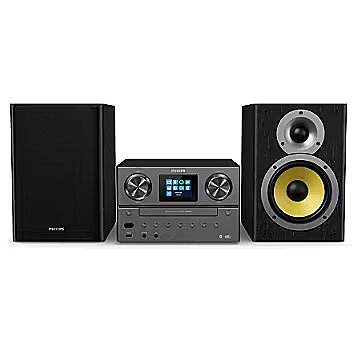 Description - All your music, podcasts and more From classic tunes to the latest podcasts. You can stream Spotify's best-quality signal over Wi-Fi with Spotify Connect. You can also stream playlists and more via Bluetooth, play CDs or connect to other sources via audio-in or USB. Internet radio. DAB+ FM radio Internet radio is your ticket to thousands of global stations broadcasting every conceivable kind of programme. The digital tuner delivers crystal-clear reception and you can set presets for your favourite internet, DAB+ or FM stations. Bass-reflex loudspeakers. Crisp highs and rich low tones Bookshelf-style loudspeakers give you great sound with crisp highs from the dome tweeters and powerful bass from 5.25" woofers and bass-reflex ports. A 100 W maximum output brings big sound to any room. Perfect for a lounge or open-plan living space. Classic looks. Modern functions The matte aluminium central unit and wooden speaker cabinets recall the design of hi-fi separates. A clear colour display shows the source or station, as well as album art and song information. Textured dials control volume, source selection and tuning. Digital Sound Control. Choose a preset sound style Hip-hop or choral, symphony or rock opera? Whatever you love, this micro system's Digital Sound Control function lets you enjoy it more. Pick from preset sound styles designed to bring out the best in your music. At home in your home This AC-powered micro system looks great in any room. Bluetooth wireless range is 10 m and you can charge a smart device via the USB port. An easy-to-use remote puts key functions at your fingertips.