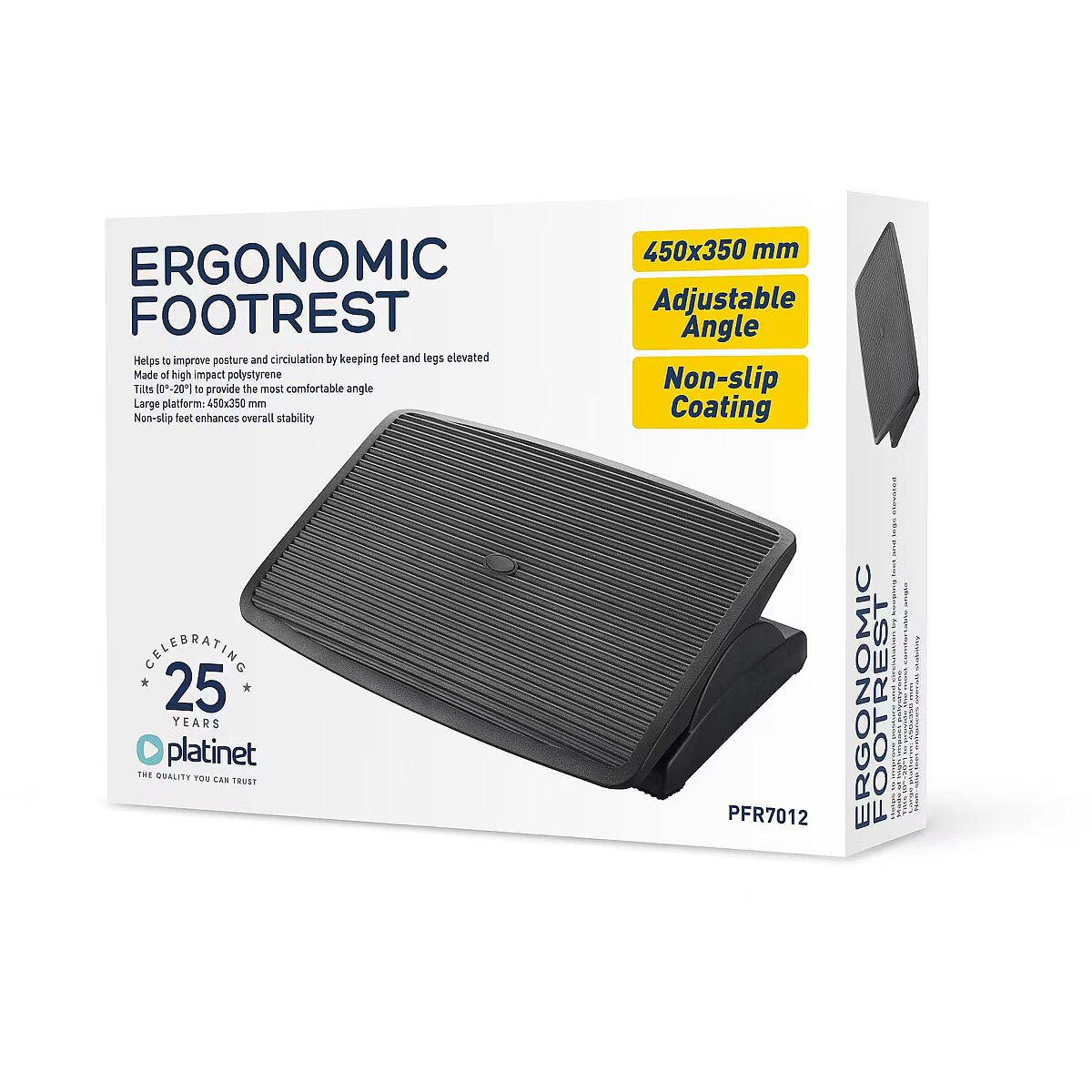 description_en - The Platinet PFR7012 ergonomic footrest is a practical aid for anyone who spends long hours sitting. By elevating the feet, it supports blood circulation, improves posture and reduces fatigue. The wide platform offers enough space for even larger feet, while the non-slip surface ensures safe and stable use in any environment. Thanks to the adjustable height and up to 20° tilt angle, the footrest can be conveniently adjusted to your personal needs. The durable polystyrene construction ensures a long service life both at home and in the office. Dimensions: 450 × 350 × 91 mm Tilt angle: up to 20° Made of impact-resistant polystyrene Large, non-slip platform