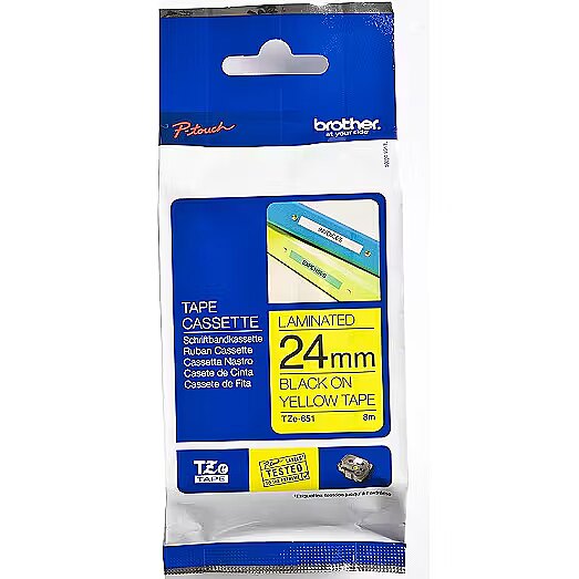 Technical_details - TZe tapes are compatible with all existing TZ tape machines. TZe tape offers enhanced eco-credentials and will replace our original TZ tape range. Extensive testing has been performed to ensure that P-touch Tze labels are incredibly durable under all kinds of conditions. They hold up extraordinarily well - and stay crisp, legible and affixed - even when subjected to abrasion, extreme temperature, industrial chemicals and sunlight. Abrasion Resistant P-touch TZe Labels - Brother's patented tape technology ensures that Brother P-touch laminated labels can withstand even heavy abrasion. Temperature Resistant P-touch TZe Labels - Whether you want to use our labels in freezing conditions or extremely warm environments, Brother P-touch laminated labels have been designed to last. We know this because we have tested them to the extreme. In fact, results show that our laminated labels can withstand temperatures from -80°C to 150°C. Fade Resistant P-touch TZe Labels - Wherever you use PTouch laminated labels, they will stay as clear and legible as the day they were applied. Water and Chemical Resistant P-touch TZe Labels - Testing TZe labels to the extreme has found them to be waterproof and resistant to chemical spill. Brother TZe labels stick to virtually any surface and are durable enough to withstand scrapes and abrasions. Because TZe TAPES are water resistant, they can be used outdoors, as well as indoors. They shrug off spills of any kind; from water, to oil, to chemicals and won't fade under harsh UV rays. And these TZe labels stay on through hot and cold environments from freezers to microwaves. Featuress - 24mm Tape Black on Yellow