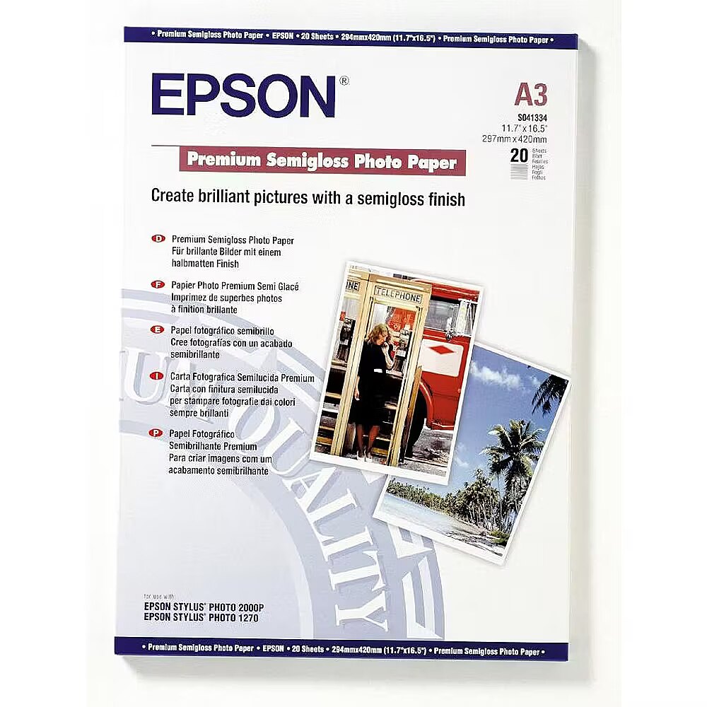 LongSummaryDescription - Epson Premium Semigloss Photo Paper, DIN A3, 251g/m², 20 Sheets. Finish type: Semi-gloss, Media weight: 251 g/m², Paper size: A3. Quantity per pack: 1 pc(s), Package width: 310 mm, Package depth: 430 mm. Pallet width (UK): 100 cm, Pallet length (UK): 120 cm, Pallet height (UK): 120 cm. Country of origin: Japan