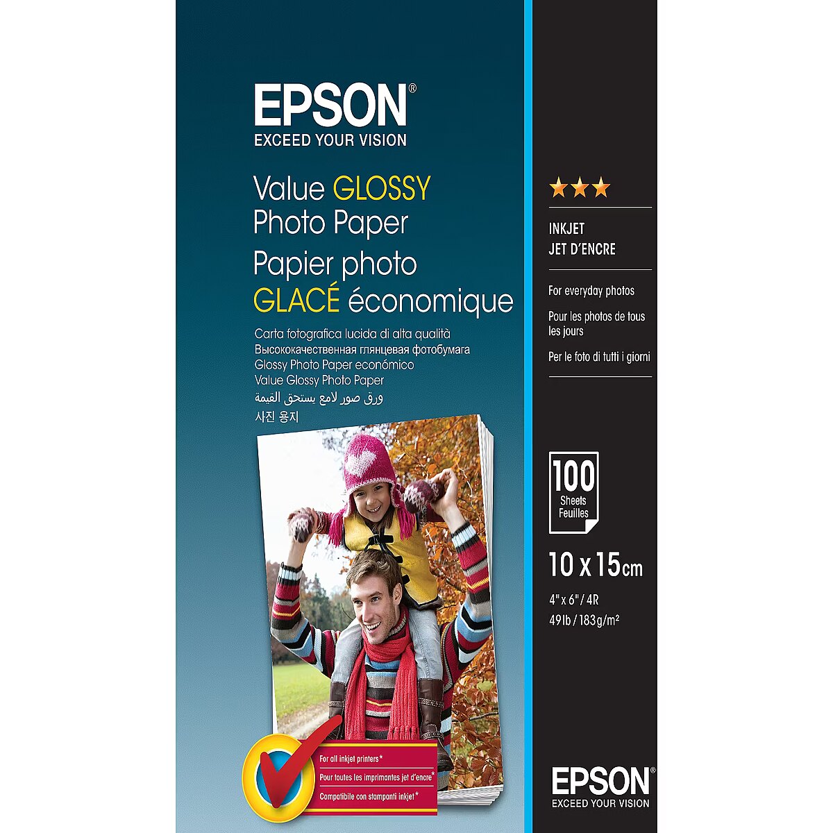 LongDesc - Everyday photo printingWhether it’s the latest holiday snap destined for the fridge, pictures for a school project, or clippings for a mood board, this value photo paper will deliver Epson quality every time.Printing is a partnershipThis photo paper has been specially developed to work with Epson's range of inks to deliver the best possible quality. It can also work with any brand of rear feed inkjet printer.Fit for purposeEpson provides a selection of photo papers to ensure there’s the right product at the right price for every situation. The new 183gsm three-star Value Glossy Photo Paper takes pride of place at the entry level of Epson’s range. For those looking for a professional or archival quality, Epson also provides the resin-coated 200gsm four-star Glossy Photo Paper, 255gsm five-star Premium Glossy Photo Paper, and finally the 300gsm five-star-plus Ultra Glossy Photo Paper.Choice and versatilityIdeal for an array of uses, the Value Glossy Photo Paper comes in two sizes; A4 and 10x15cm, and is available in varying pack sizes; 20, 50 or 100 sheets. The paper comes in a resealable bag, making it easy to keep it safe from moisture and light.