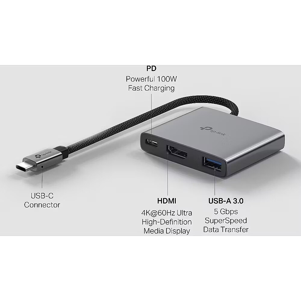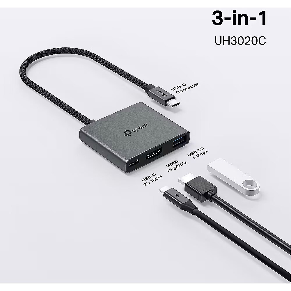 Description - TP-LINK UH3020C 3 in 1 USB-C Hub: UH3020C turns a single USB-C port into 3 ports with a 4K@60Hz HDMI, 100W Power Delivery, 1× USB-A Data Ports. Ultra High-Definition Media Display: Connect to an external monitor via the 4K@60Hz HDMI port for a stunning ultra high-definition experience. Powerful 100W Fast Charging: Plug the charging cable into UH5020C and continuously deliver up to 100W of power to your PC while transferring files or streaming media. 5 Gbps SuperSpeed Data Transfer: UH3020C adds three USB 3.0 ports to your device, enabling simultaneous use of multiple USB devices. Easy to Use with Plug & Play: Simply plug in and start using in seconds, thanks to driver-free install with Mac OS, Windows 11/10/8.1/8/7, Linux OS, iPadOS, iOS, Android, Chrome OS, and Nintendo OS.