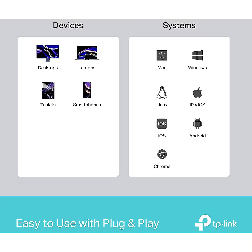 Po prostu podłącz urządzenie i zacznij korzystać z niego w ciągu kilku sekund. Instalacja nie wymaga sterowników w systemach takich jak macOS, Windows 7/8/8.1/10/11, Linux, iPad OS, iOS, Android oraz Chrome OS.
