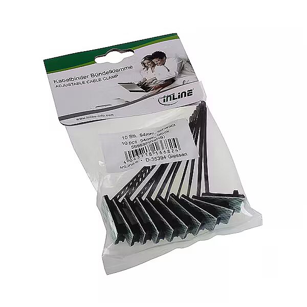 LongSummaryDescription - InLine Ajustable Cable Clamp 94mm black 10pcs. Product colour: Black. Length: 94 mm, Weight: 31 g, Package width: 120 mm. Quantity per box: 10 pc(s). Quantity per pack: 10 pc(s)