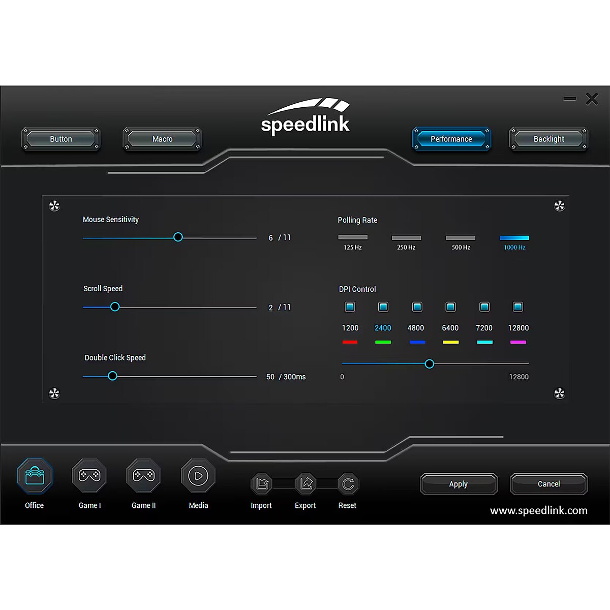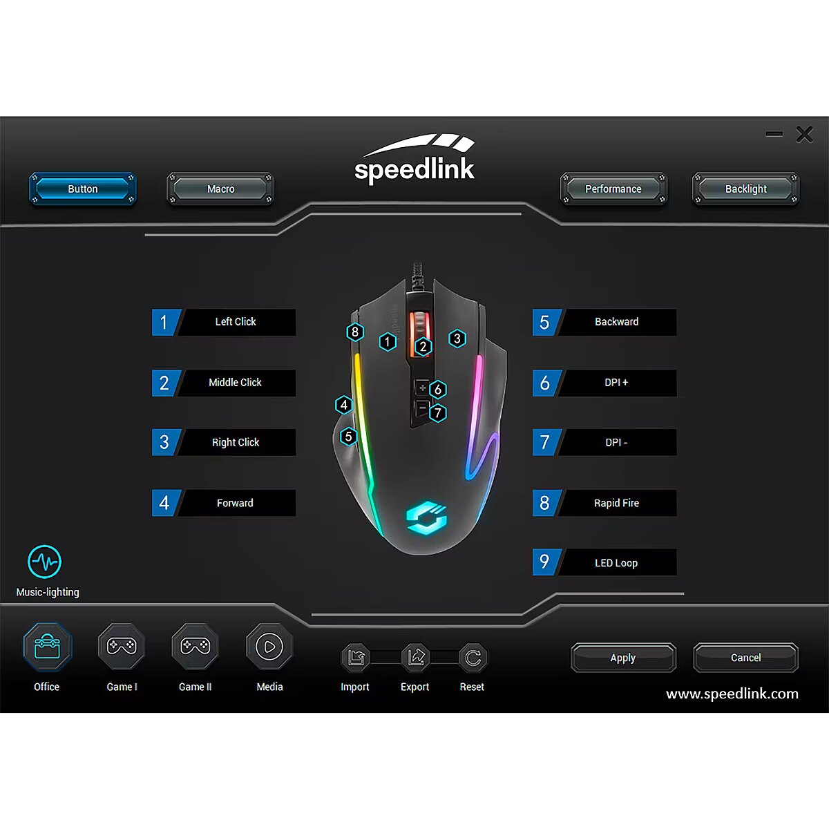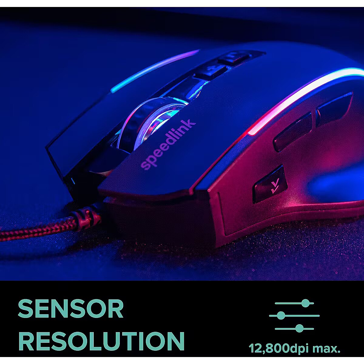 description_en - Gaming at the highest level with the Speedlink DECUS NX RGB gaming mouse. This powerful mouse with stylish lighting offers everything you need for precise and responsive gaming. With 6 buttons (including a rapid-fire button) and 2 dpi switches that enable lightning-fast adjustment of the sensor resolution (configurable from 200 to 12,800dpi in 6 steps), every situation is under control. The multi-coloured and configurable RGB lighting sets individual accents. The lighting can be configured via the software or switched to different modes using a button on the underside. The rubberised surface and ergonomic shape of the mouse ensure optimum grip and prevent slipping during heated battles. With a customisable polling rate of up to 1000Hz and a maximum sensor acceleration of 20g, maximum performance is offered. A tracking speed of up to 60ips ensures precision. The configuration software allows macros to be defined, key assignments to be customised and various profiles to be saved. The braided cable with a length of 1.8 metres offers flexibility and durability. Gaming mouse with 6 buttons (incl. rapid fire button) + 2 dpi switches Multicolour configurable RGB lighting with various modes (can also be switched off) Rubberised surface for optimum grip Fabric-covered cable Sensor resolution: 200 to 12. 800dpi (real) with configurable dpi levels Configuration software with multiple profiles and macros Configurable buttons and lighting Internal memory Polling rate: 1000Hz (125/250/500/1000Hz adjustable) Maximum sensor acceleration: 20g Maximum tracking speed: 60ips