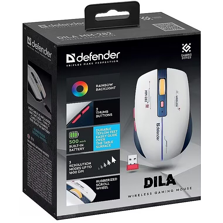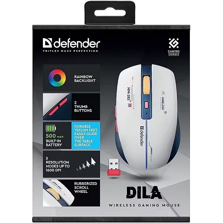 Description - Dila MM-282 Wireless Gaming Mouse Comfortable and lightweight wireless gaming mouse with a modern design. Features rainbow lighting, a built-in 500 mAh battery, 2 additional side buttons, 3 DPI modes, and Teflon feet for smooth movement across the desk surface.