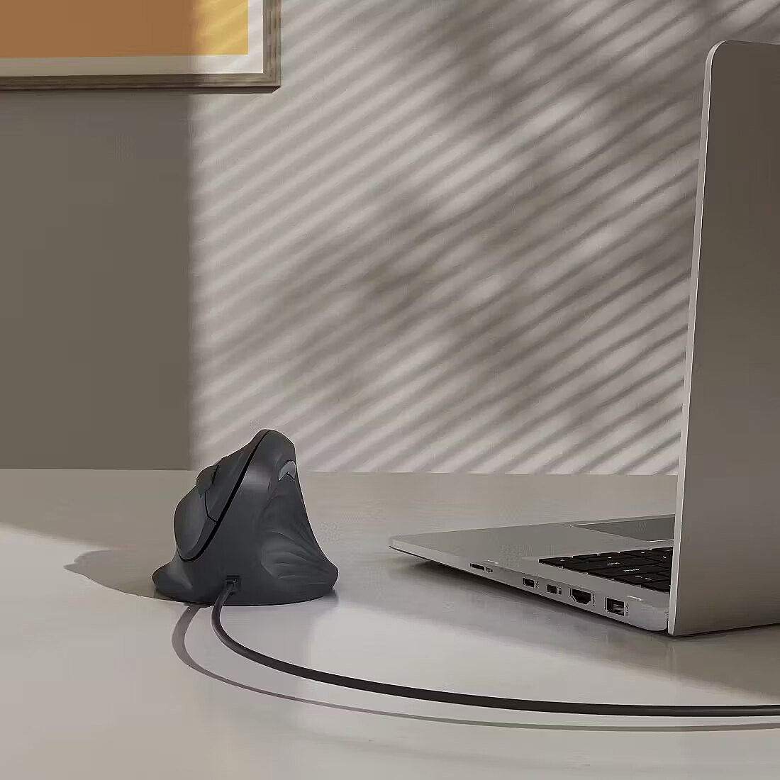 LongDesc - Convenient, precise and silent: the cabled, ergonomic, vertical mouse allows right-handed people to work enjoyably and without pain on the PC or laptopVertical mouse for ergonomic workingBye bye mouse arm: the ergonomic mouse supports a natural angle between the hand and wrist at an ergonomic workstation, thereby preventing shoulder pain, tendon sheath inflammation and pain in the wristAI assistant for many programsMore productive with artificial intelligence: Assist button activates the cross-program AI assistantWhisper-quiet buttonsQuiet mouse, no clicking noises: whisper-quiet buttons ensure undisturbed and relaxed working with the wireless mouseBrowser buttonsHandy side buttons: the browser buttons on the wireless mouse support the forward/back function for easy navigation, e.g. in web browsers, Outlook, etc.USB receiver can be stowedA place of its own: the stowable USB receiver can be transported in a space-saving manner inside the mouse housing> 20% from demonstrably recycled sourcesAnd so the circle closes: this product is made up of at least 20% recycled materials, enabling us to take part in an eco-friendly cyclePlastic-freePackaging with a clear conscience: our packaging is 100% plastic-free, enabling us to reduce plastic waste and increase its recyclability