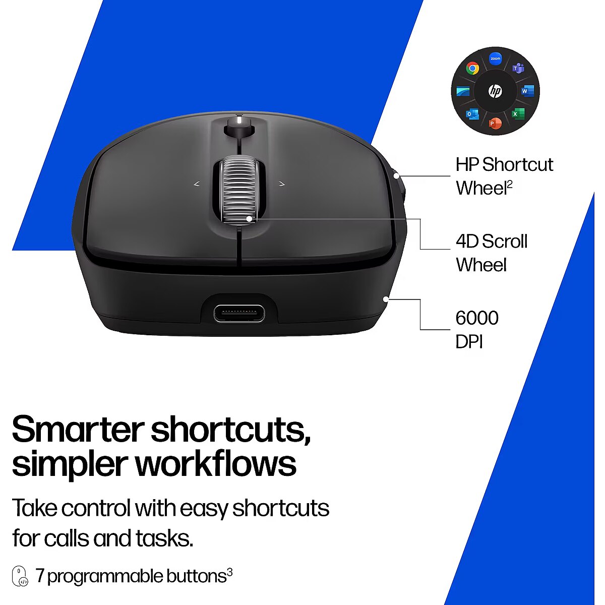 Simplify workflows and access smarter shortcuts to conference calls and productivity tasks with the HP Shortcut Wheel, 7 programmable buttons, and a dedicated Copilot button and metal, fast scrolling wheel.