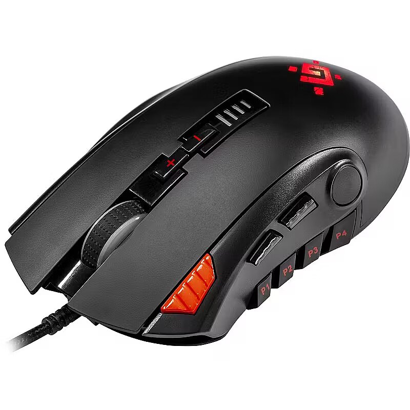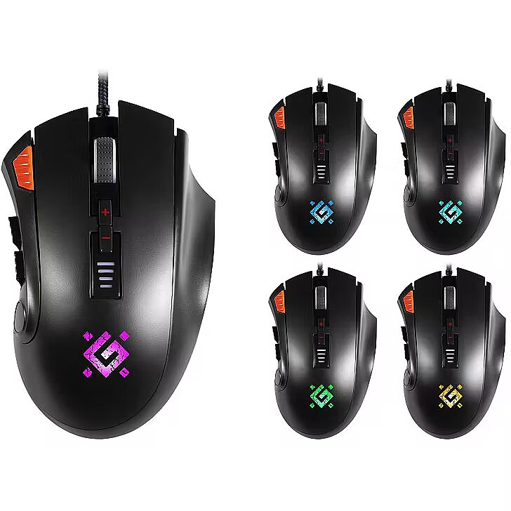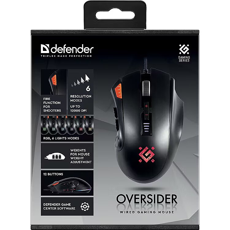 Description - Defender Gm-917 Oversider RGB Optic 12000dpi 12p mouse 6 backlight modes FIRE function for shooters 5 programmable macro keys Weights to adjust the weight of the mouse Defender Game Center software Precision optical sensor Macro editor Keyboard button emulation Stable operation even at high speed Wide 8mm rubberised wheel (with illumination) Braided cable structure Ferrite noise filter
