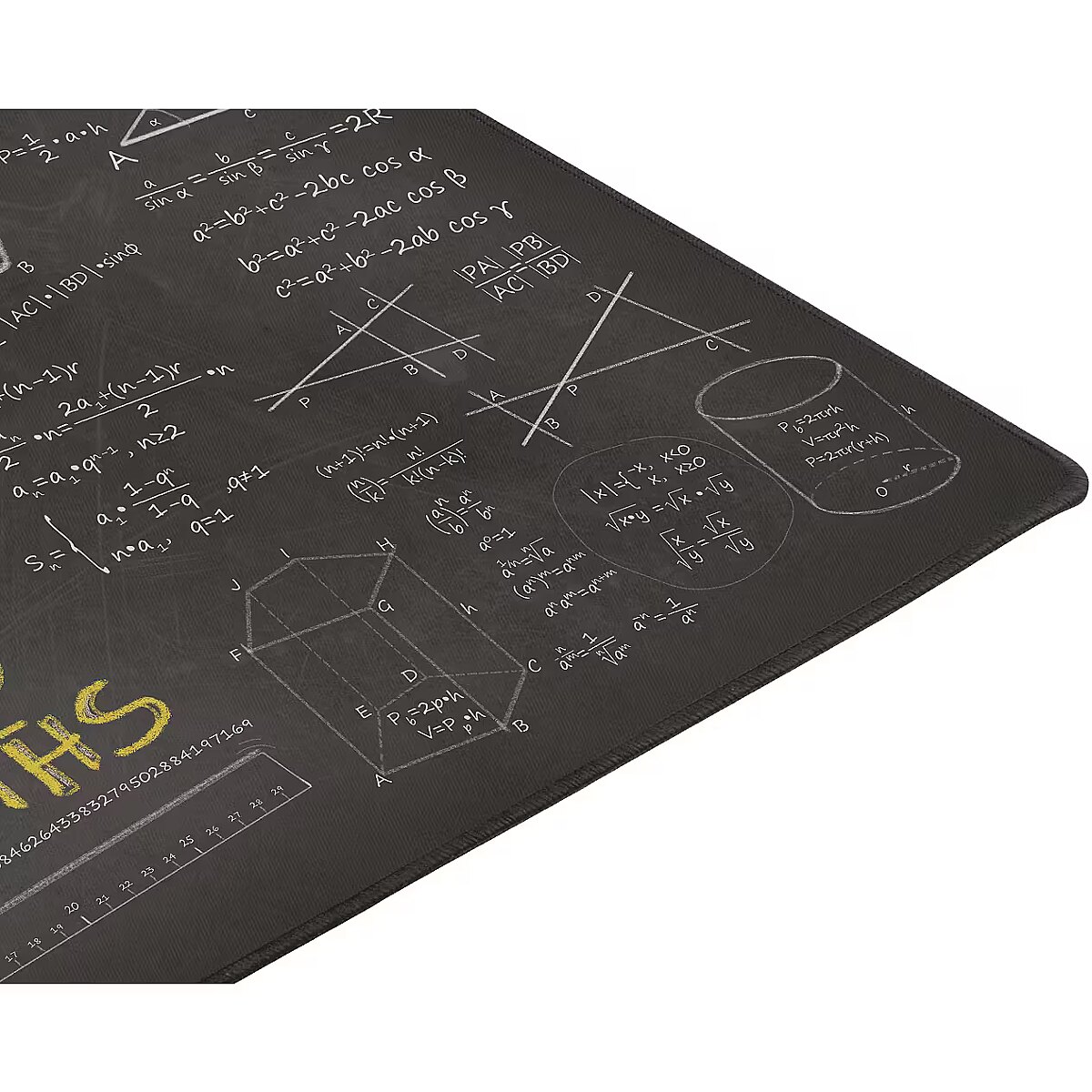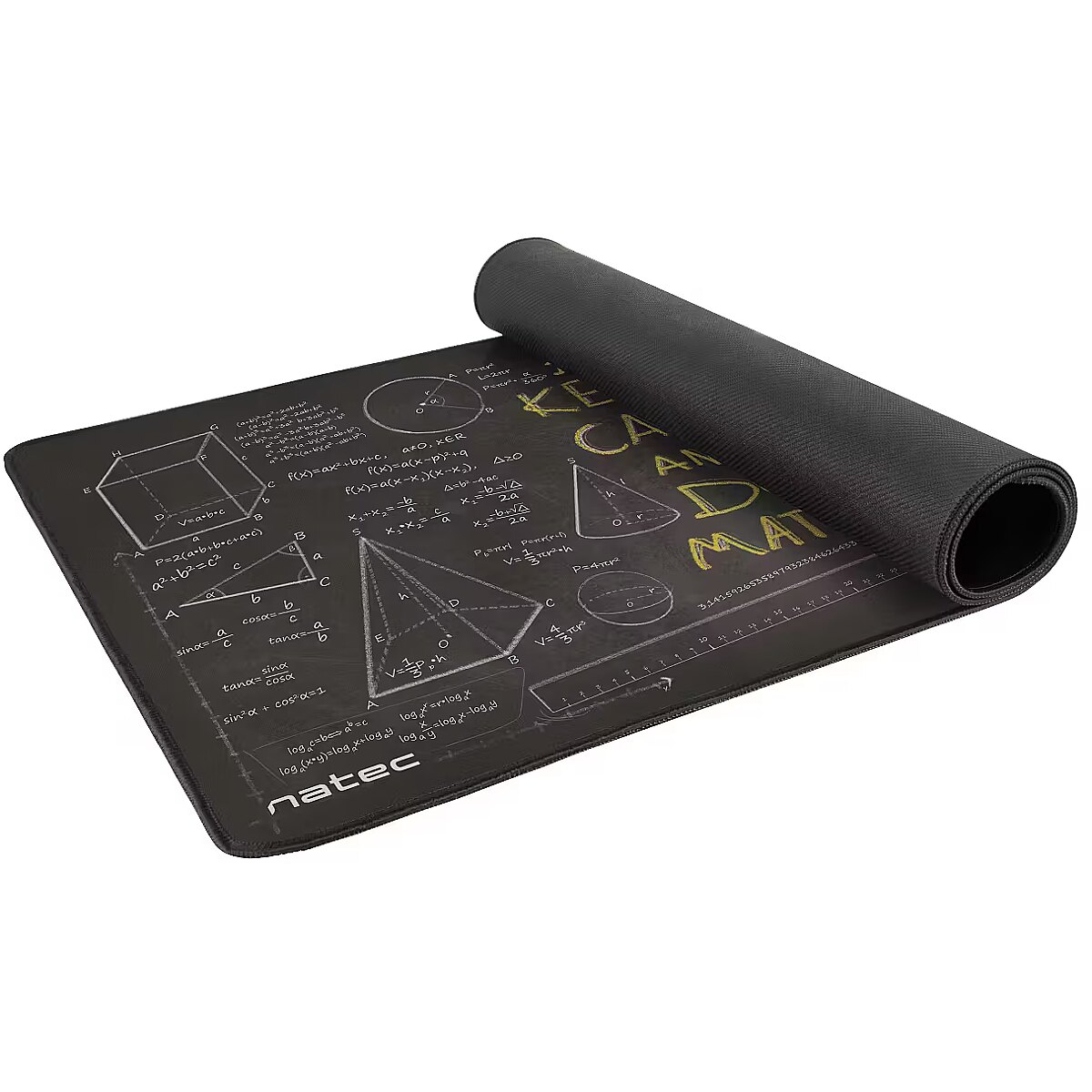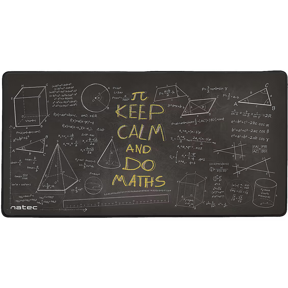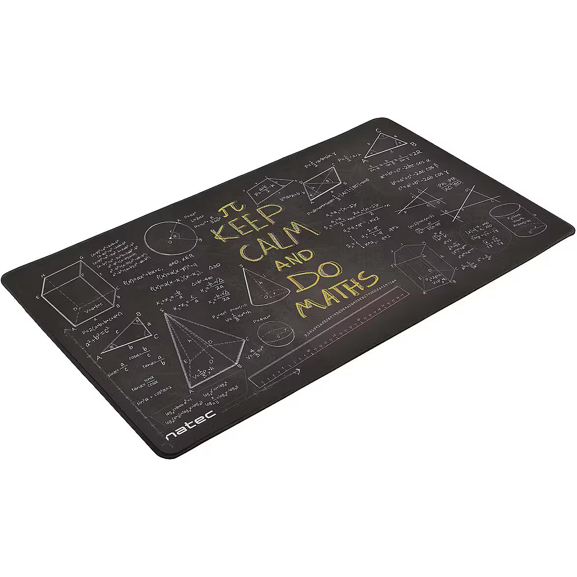 Description - MOUSEPAD NOT ONLY FOR MOUSE Small computer mouse pads can be annoying curved corners, jagged edges ... This is a thing of the past! Natec Maths is a very large pad with the dimensions of 800x400mm, which will fit not only the mouse, but also a keyboard. Thanks to its large surface, the pad protects the desk top against damage and due to its excellent quality, it will serve the user for a long time. UNIQUE AND PRACTICAL GRAPHICS The main feature of Natec Maths is the unique design imitating a blackboard with mathematical formulas including geometry, trigonometry, algebra and basic formulas of series and functions. The design was enhanced by geometric shapes and a large humorous slogan in the middle Keep Calm and Do Math. Thanks to this, the pad not only facilitates the use of the mouse, but also helps during work, play or study being great help for every student. Unobtrusive colours make the pad an interesting complement to the interior design. EXCELLENT PERFORMANCE QUALITY The external waterproof layer of the pad was covered with a fabric providing the right precision in tracking mouse movements while reducing its friction. The bottom layer is covered with rubber, the task of which is to guarantee adhesion of the product. In addition, the low profile increases the comfort of using the mouse, but also helps during work, study or play.