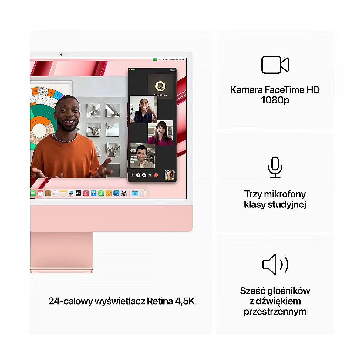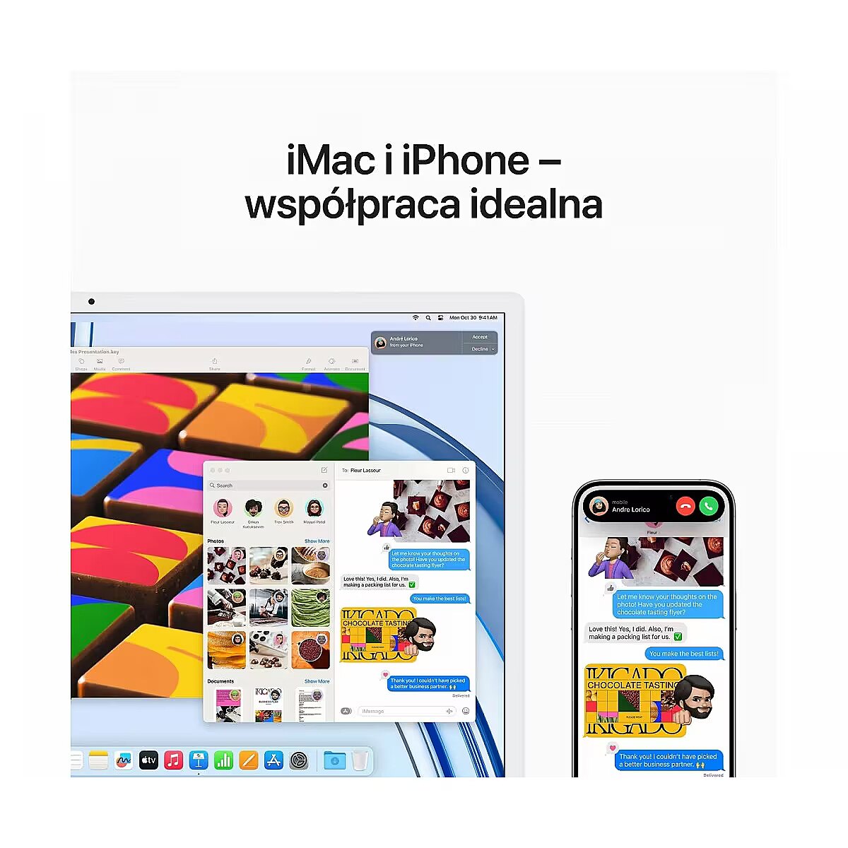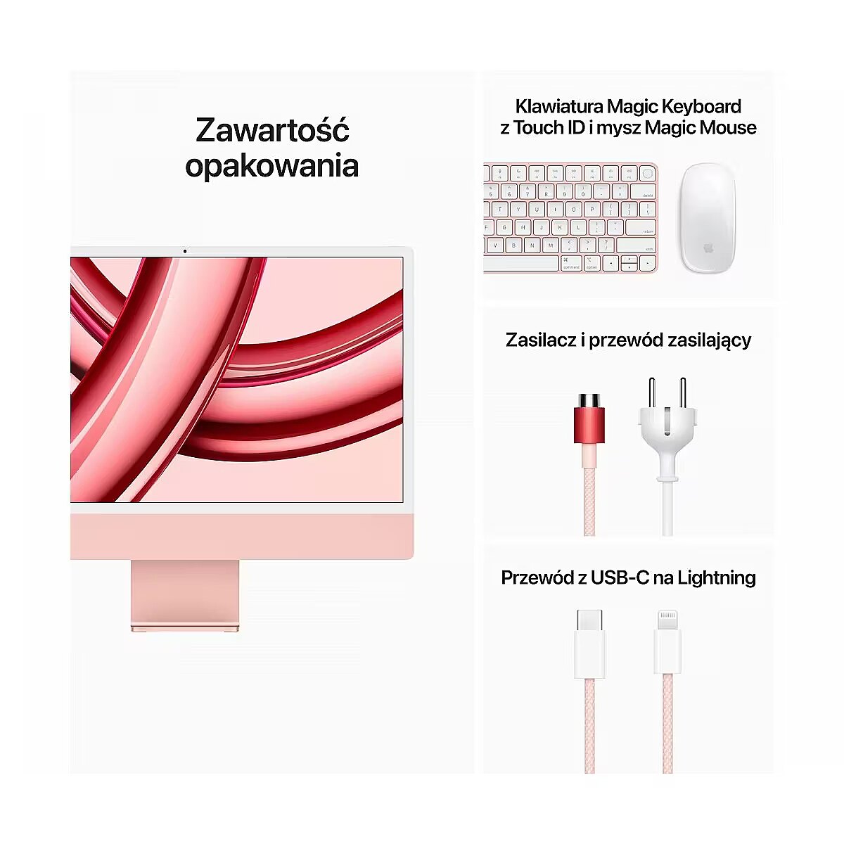 Description - Imbued with power. An excellent allinone computer, now turbocharged with the M3 chip. With a dazzling 24-inch screen with room for everything. And iconic design that will enliven any place. iMac is ideal for those who work and play. Or vice versa. Less than 11.5 mm. Impressively slim. The iMac owes its unusual design to the Apple integrated circuit, which in the M3 version dramatically increases its performance. M3 is the main processor, graphics processor, memory and other components integrated in one chip. Thanks to it, we were able to fit the entire computer into a housing so flat that it almost disappears from the profile. Hyperfast Thunderbolt ports. And lightning-fast file transfer via WiFi 6E Power supply with magnetic connection. With matching woven cable. It's absolutely dazzling. The detail is breathtaking. On the huge 24-inch Retina display, you have plenty of space for multitasking and engaging entertainment - games, movies, and anything else you can imagine. 4.5K resolution brings out incredibly sharp details. The image is stunning with a brightness of 500 nits. And thanks to P3's wide color gamut, everything comes alive with over a billion colors. No matter what you do, it looks amazing on your iMac. FaceTime HD 1080p camera. A dream-like close-up. This is the best camera system on the iMac yet. The M3 chip with a built-in ISP processor analyzes and improves each pixel at a rate of over a trillion operations per second, thereby improving image quality. This translates into excellent noise reduction, incredible dynamic range and more balanced exposure. And you look great in any lighting. M3 also works with macOS, so when you use Presenter Overlay during a video conference, you stay in focus on the content being shared. Studio-grade microphones. Conversations with the class. When you're on a video call, recording a podcast, or broadcasting live, iMac's microphones keep your voice clear and crisp. A studio-grade three-microphone array minimizes feedback, and acoustic beamforming technology is exceptionally effective at reducing background noise. As a result, everyone hears you and not what is around you. Six-speaker system. Sound reaches everywhere. iMac will fill any space with unrivaled sound. Two pairs of forcecancelling woofers generate rich, deep bass. Each of these pairs is balanced by a high-power tweeter. The result is a spacious acoustic scene, and music, movies and everything you listen to take on extraordinary expression. iMac also supports surround sound with Dolby Atmos. And when you add a 4.5K Retina display, your room turns into a cinema. M3 and macOS. And you take in everything in no time. M3 and macOS bring the latest and most advanced technologies to your iMac, ensuring extraordinary levels of performance, energy efficiency and security. The M3 chip was made using a new generation process. It easily handles hundreds of tabs in the browser, allows you to create multimedia-rich presentations and explore new worlds with breathtaking graphics. In addition, the iMac is quiet and runs cool even under heavy load. This is the spectacular power of hardware, software and integrated circuits - designed together. Safari on iMac is up to 30% faster. Additionally, it allows you to create personalized profiles and securely share passwords or digital keys. Games on the M3 are stunning, running at up to 50 percent higher frame rates. And with hardware-accelerated ray tracing, light and reflections look more natural. In Adobe Photoshop, you can edit photos up to 2x faster and easily create huge images, even 100 megapixels. iMac and iPhone. Matched pair. Everything that the iPhone has to offer, the iMac will show on a dazzling 24-inch screen. And what you keep on your iMac can be accessed from anywhere with iPhone. Together they can work wonders. Calls and messages come straight to your iMac, so you don't have to reach for your phone and get distracted. Universal Clipboard lets you copy texts, images, photos and more on your iPhone and then paste them on your iMac. Plus, photos and scans of documents taken with your iPhone will automatically appear on your iMac. Everything in color. You can choose a color-matched keyboard, mouse and trackpad for your iMac. Magic Keyboard with Touch ID lets you easily and securely unlock your iMac, switch users, use Apple Pay and download apps9. And the Magic Mouse and Magic Trackpad provide comfortable and intuitive navigation. Designed with the planet in mind. We designed the iMac to have as little impact on the natural environment as possible. The virgin wood fibers in its packaging were obtained entirely from responsibly managed forests. The aluminum from which the stand is made is 100% recycled material. The rare earth elements in the speaker magnets, fan motor and power connectors are also exclusively recycled. We also made commitments to use 100 percent electricity from renewable sources in the entire supply chain by 2030.