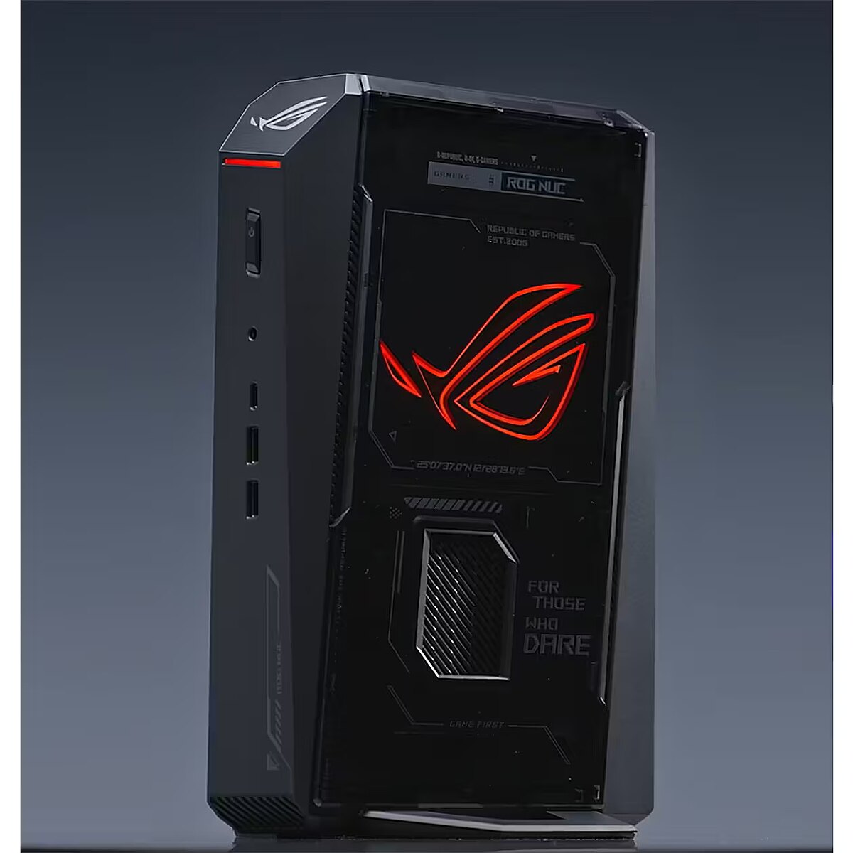 LongDesc - Gaming RedefinedPower Meets PrecisionUnlock new gaming horizons with ROG NUC (2025), powered by the Intel® Core™ Ultra processors (Series 2) ARL-HX and up to NVIDIA® GeForce RTX™ 5080 Laptop GPU. Equipped with triple fan cooling and support for four 4K displays, this compact powerhouse delivers unprecedented performance.