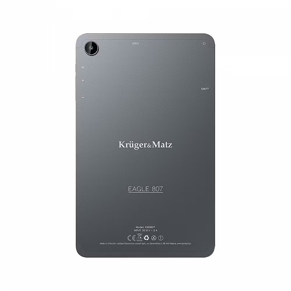 Description - Kruger&Matz EAGLE 807 tablet You don't know which tablet to buy? Choose a combination of impressive functionality, stylish design and attractive price. Kruger&Matz EAGLE 807 offers you all this and more. Let yourself be surprised by the possibilities this tablet opens up to you! 8.4 inch screen Is tablet image quality important to you? EAGLE 807 is equipped with a screen with a diagonal of 8.4 and a resolution of 1200 x 1920 px. Comfortable use of the device even in the brightest sunlight is additionally guaranteed by the IPS matrix. Performance on par The eight-core Unisoc Tiger T606 processor clocked at 1.6 GHz used in the EAGLE 807 combined with 4 GB of RAM create a harmonious and efficient whole. Thanks to this, your tablet can easily handle several applications at the same time or play movies and games in high resolution. Keep this in mind The Kruger&Matz EAGLE 807 tablet will allow you to store a really large amount of files, music and applications. The device is equipped with 64 GB of internal memory, which can be increased up to 2 TB using a memory card. Android 13 Check the optimized operation of the Android 13 system. The use of the latest version of the system in the EAGLE 807 tablet focuses on improving efficiency, privacy and comfort of use, providing you with modern and advanced solutions. In virtual contact Do you need a tablet for remote learning for your child? Or maybe you're going to have a video conference with your colleagues? Thanks to the 5 Mpix front camera, EAGLE 807 is perfect for online communication. Freedom of communication A tablet with an LTE modem is an ideal solution for anyone who does not want to make contact with the virtual world dependent on tethering and publicly available Wi-Fi networks. Use the SIM card slot and LTE modem that EAGLE 807 is equipped with and enjoy constant access to the Internet. Always with you Take your tablet with you everywhere and don't worry about the battery running out! This, used in the EAGLE 807 model, will provide you with many hours of comfortable use of the device, without the need to connect it to the power supply.