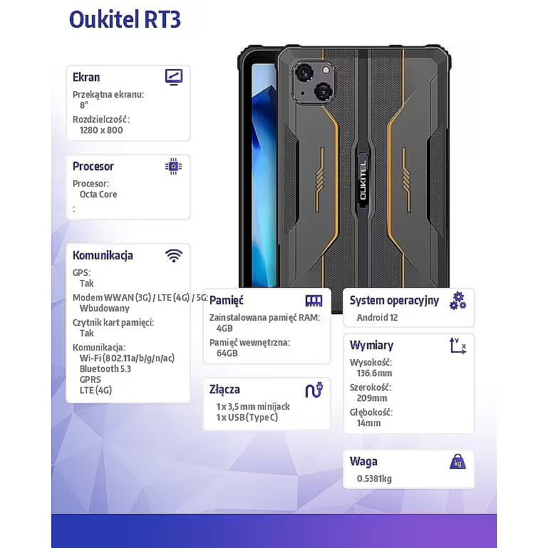 ShortDescription - 8" IPS | Helio P22 | 4GB/64GB | Trzy kamery | BT | LTE | IP68/IP69K | Android 12