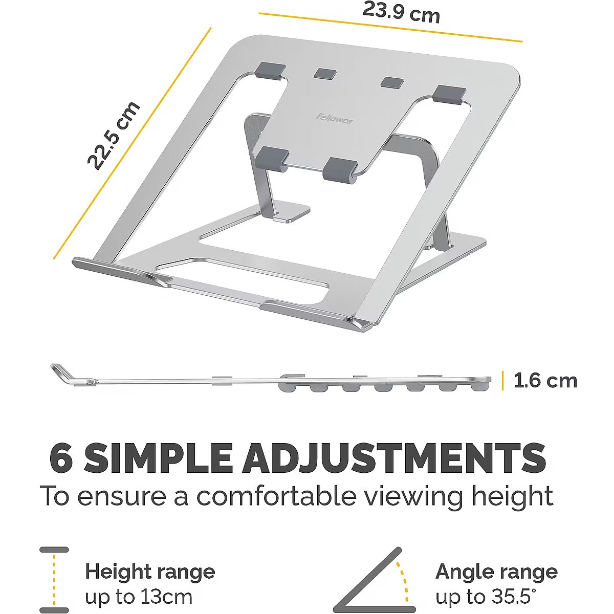 LongDesc - The Fellowes Alumia Portable Laptop Stand is designed to help minimise discomfort in your workspace by elevating your laptop to a more ergonomically correct viewing position, reducing neck and eye strain. It supports laptops up to 5kg in weight and screen sizes up to 15 inches. With six easy-to-use height adjustments ranging from 8.1 to 13 cm, it promotes good posture and all-day comfort. The compact and lightweight design folds flat, making it perfect for storage or on-the-go use - ideal for hybrid working environments. Nonslip pads keep your laptop securely in place, while the open design enhances air circulation to help keep your device cool. The Alumia Portable Laptop Stand is FIRA-accredited, meeting the ergonomic requirements of European Health and Safety legislation (EN ISO 9241-5). This laptop riser comes with a 5-year warranty and access to top quality customer support to help with any queries you may have.