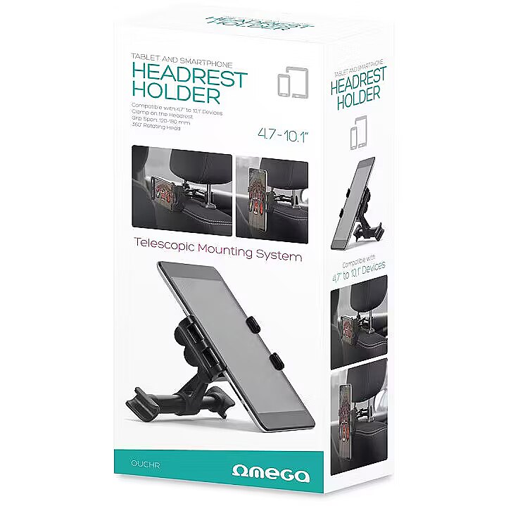 description_en - The Omega OUCHR universal mount holds a device with a 4.7- to a 10.1-inch screen. The holder is mounted on the car seat headrest. The high-quality holder helps you use your smartphone or tablet hands-free, comfortably, and safely. The adjustable handle ensures the stability of the device and allows it to be rotated up to 360°. Dimensions: 170 × 65 × 115 mm Weight: 142 g