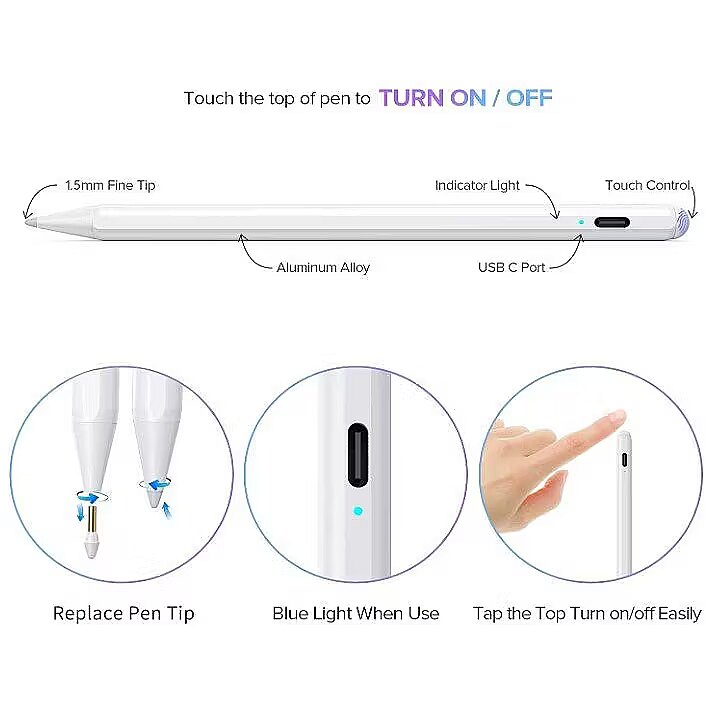 Uzlādes laiks: description_ru - Умный Bluetooth стилус совместимый с iPad планшетами от 2018 года выпуска - тонкий и легкий, как обычный карандаш. Перо с наконечником 1,5 мм обеспечивает точное письмо благодаря и создает ощущение реалистичности во время рисования. Так же вы можете положить руку на экран благодаря встроенной функции отклонения ладони.