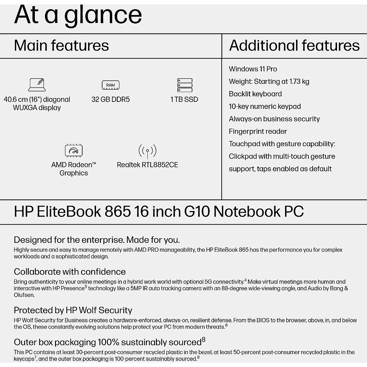 LongSummaryDescription - HP EliteBook 865 G10. Product type: Laptop, Form factor: Clamshell. Processor family: AMD Ryzen™ 9, Processor model: 7940HS, Processor frequency: 4 GHz. Display diagonal: 40.6 cm (16"), HD type: WUXGA, Display resolution: 1920 x 1200 pixels. Internal memory: 32 GB, Internal memory type: DDR5-SDRAM. Total storage capacity: 1 TB, Storage media: SSD. Mobile network generation: 5G. Operating system installed: Windows 11 Pro. Product colour: Silver