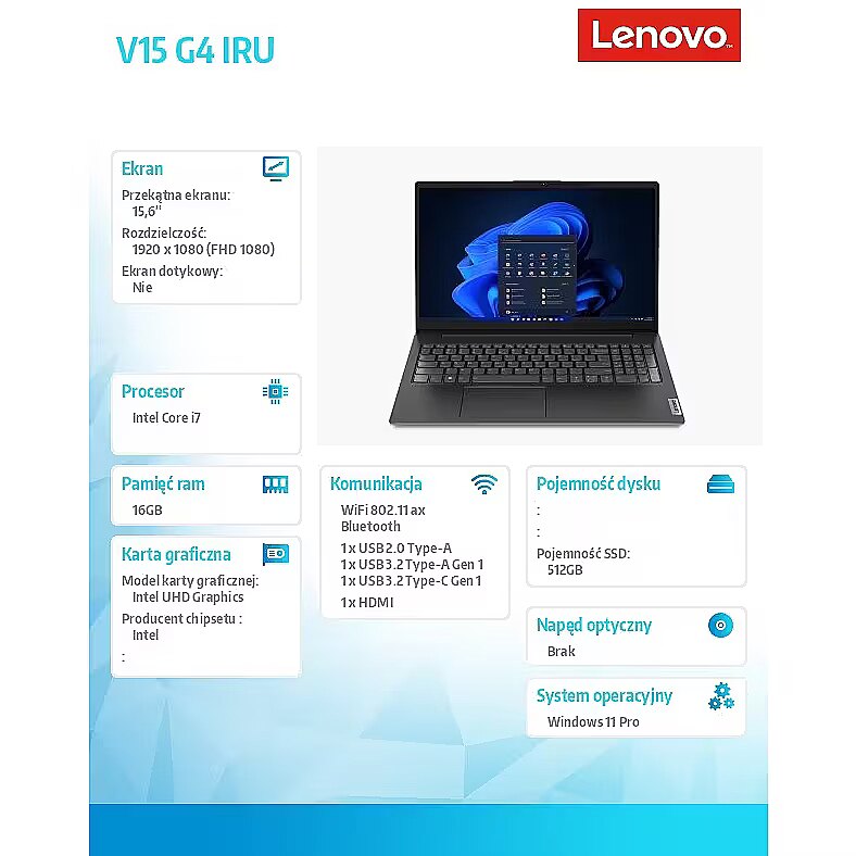 ShortSummaryDescription - Lenovo V15 G4 IRU, Intel® Core™ i7, 39.6 cm (15.6"), 1920 x 1080 pixels, 16 GB, 512 GB, Windows 11 Pro