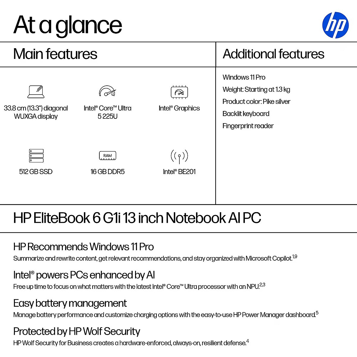 LongSummaryDescription - HP EliteBook 6 G1i. Product type: Laptop, Form factor: Clamshell. Processor family: Intel Core Ultra 5, Processor model: 225U. Display diagonal: 33.8 cm (13.3"), HD type: WUXGA, Display resolution: 1920 x 1200 pixels. Internal memory: 16 GB, Internal memory type: DDR5-SDRAM. Total storage capacity: 512 GB, Storage media: SSD. On-board graphics card model: Intel Graphics. Operating system installed: Windows 11 Pro. Product colour: Silver. Weight: 1.3 kg