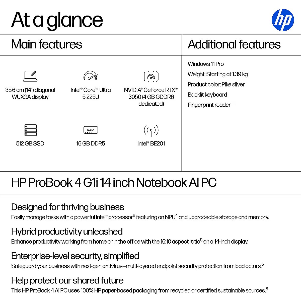 LongSummaryDescription - HP ProBook 4 G1i AI PC. Product type: Laptop, Form factor: Clamshell. Processor family: Intel Core Ultra 5, Processor model: 225U. Display diagonal: 35.6 cm (14"), HD type: WUXGA, Display resolution: 1920 x 1200 pixels. Internal memory: 16 GB, Internal memory type: DDR5-SDRAM. Total storage capacity: 512 GB, Storage media: SSD. On-board graphics card model: Intel Graphics. Operating system installed: Windows 11 Pro. Product colour: Silver. Weight: 1.39 kg