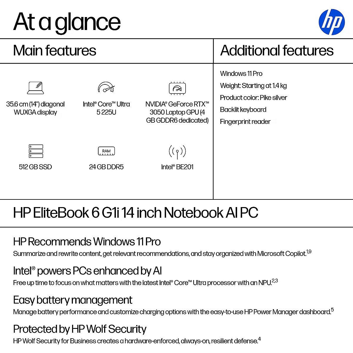 Title - HP EliteBook 6 G1i AI Intel Core Ultra 5 225U Laptop 35.6 cm (14") WUXGA 24 GB DDR5-SDRAM 512 GB SSD Wi-Fi 7 (802.11be) Windows 11 Pro AI PC Silver