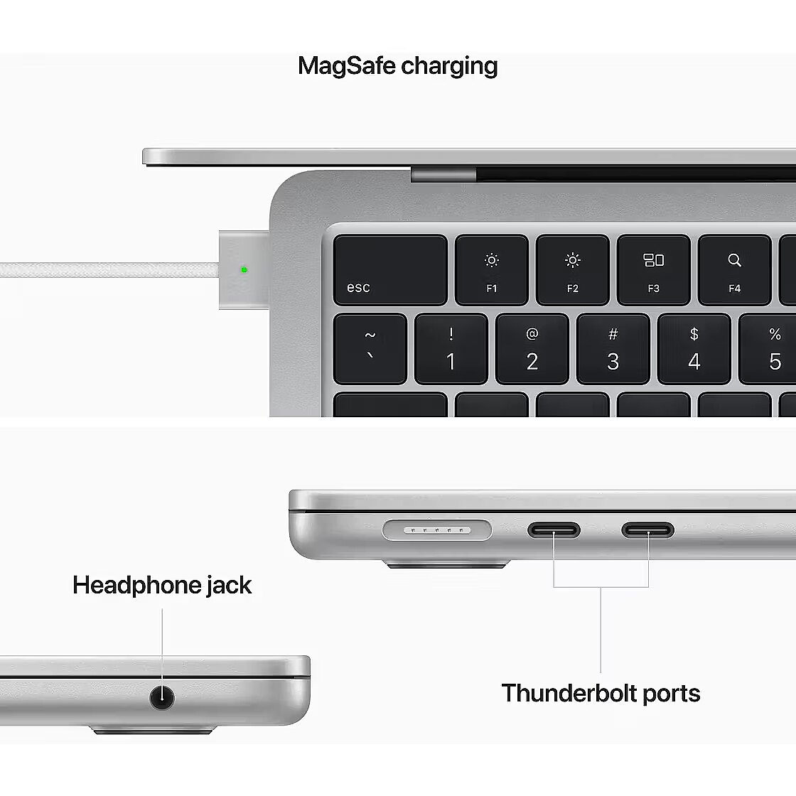 The quick-release MagSafe power connector easily attaches — and detaches — with magnets, preventing any unintended flights. Two Thunderbolt ports let you connect and power high-speed accessories. You can also connect up to a 6K display. And the headphone jack supports high-impedance headphones.