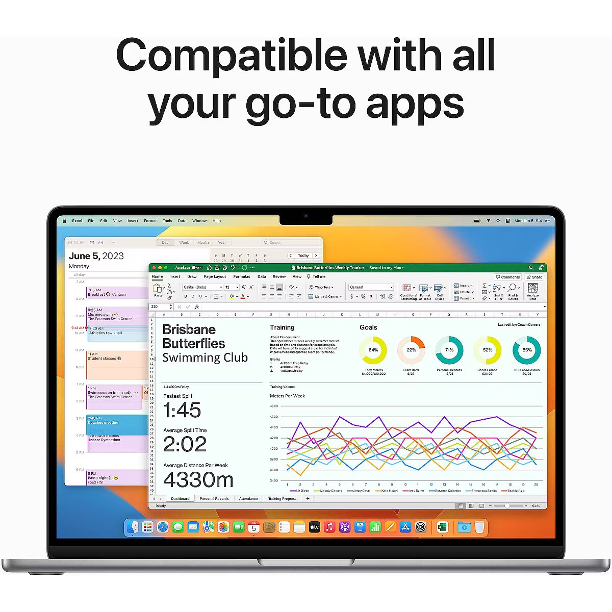 MacBook Air on täielikult sinu — vali oma suurus, vali oma värv, ja asu teele. Ükskõik millise mudeli sa valid, see on loodud planeedi heaolu silmas pidades, kasutades vastupidavat 100 protsendiliselt taaskasutatud alumiiniumist korpust. Ja ventilaatorita disain tagab, et see jääb vaikseks isegi intensiivse töökoormuse korral. Kaks ideaalset suurust. Kas valik langeb 13- või 15-tollisele sülearvutile, pole oluline, sest mõlemad mudelid on ülikerge kaaluga ja mõõdud on alla poole tolli õhukesed, nii et sa saad oma arvuti kaasa võtta kuhu iganes. Uskumatu kiirus ja aku kestvus? 🤯