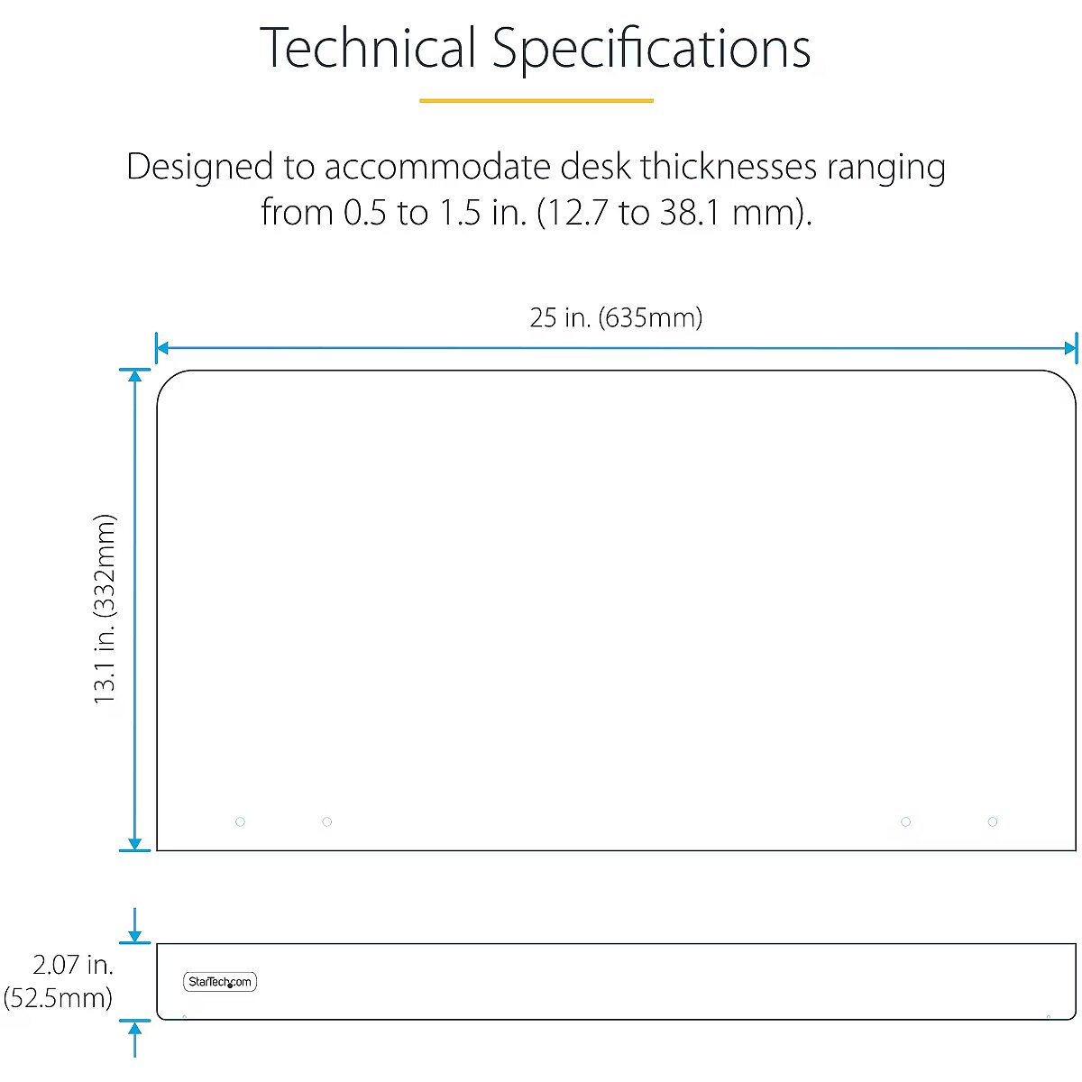 LongSummaryDescription - StarTech.com Clamp-On Steel Desk Corner Sleeve for L-Shaped/Corner Desk, For 0.5-1.5in (12.7-38.1mm) Desks, Increase Space for Keyboard/Mouse, Desk Extender/Tray For Wooden/Steel Desks, Ships Assembled. Material: Steel, Product colour: Black. Width: 332 mm, Length: 635 mm, Height: 52 mm. Products per master (outer) case: 4 pc(s), Master (outer) case length: 705 mm, Master (outer) case height: 360 mm. Compliance certificates: CE, RoHS. Package width: 370 mm, Package depth: 688 mm, Package height: 85 mm