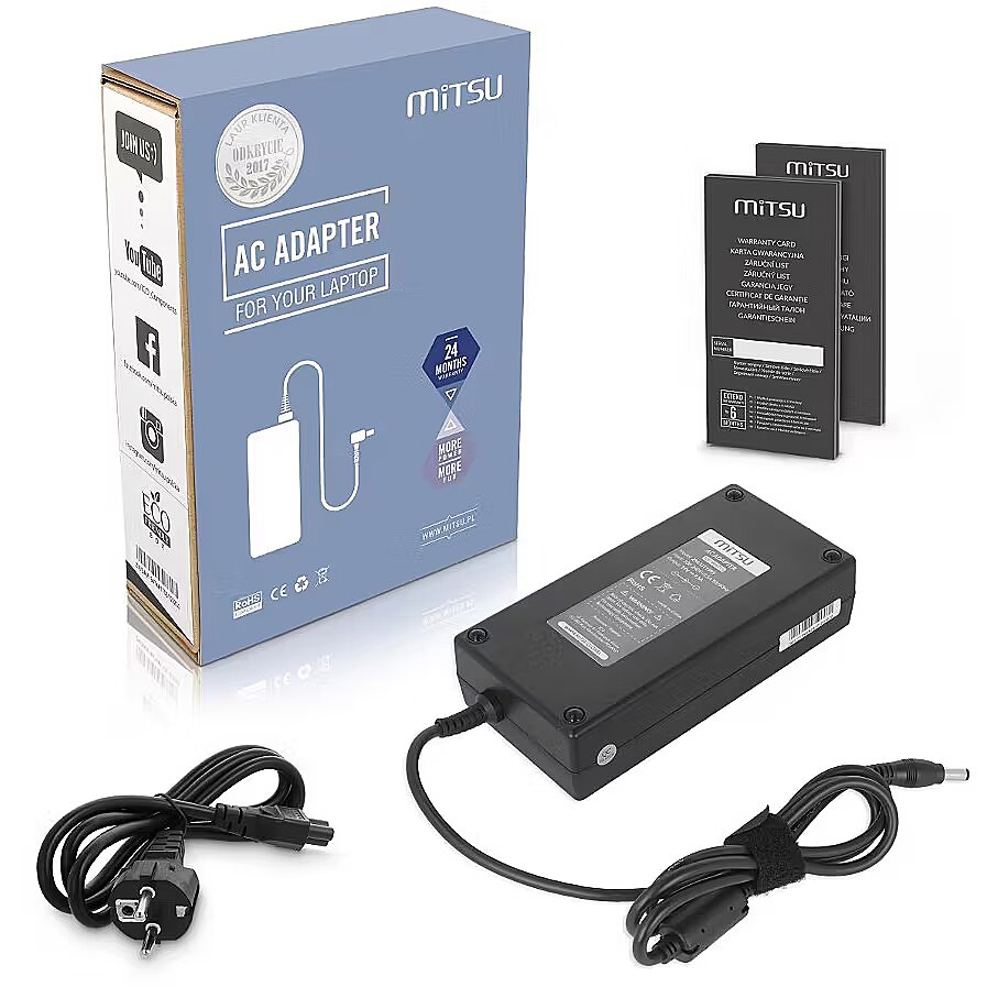Description - Product description Mitsu laptop power supply high-quality, safe and reliable replacement power supply for laptops compatible with your equipment price of the replacement, quality of the original 24-month warranty with the possibility of free extension Quality, safety, reliability Mitsu is a branded laptop charger, equipped with a set of protections against overvoltage, overheating, overload and overcharging, making it very safe to use. When producing our power supplies, we ensure their comprehensive control in every possible respect. Various tests are used for this purpose, such as: temperature resistance test, in which we examine the impact of high and low temperatures on security systems and the electrical parameters of the power supply, electrical test, which checks the correctness of electrical connections between the individual components of the power supply, short-circuit and overvoltage test, during which the response of the power supply's protection systems to a simulated short circuit or sudden voltage surge is checked, the final test, in which we control the output voltage level of the power supply by subjecting it to a constant load for an hour. Will this power supply fit your laptop? Check it by comparing the parameters below: 19.5V, i.e. the voltage of this power supply - the voltage on your laptop (INPUT) or on the original power supply (OUTPUT) should be the same; tolerance up to 0.5V is allowed, 9.5A, i.e. the current of this power supply - on the laptop or original power supply it should be exactly the same or less (not more), 5.5 x 2.5 mm, which is the plug size of this power supply, the original plug should be the same size. When purchasing this power supply, you will receive a power cord, warranty card and user manual.