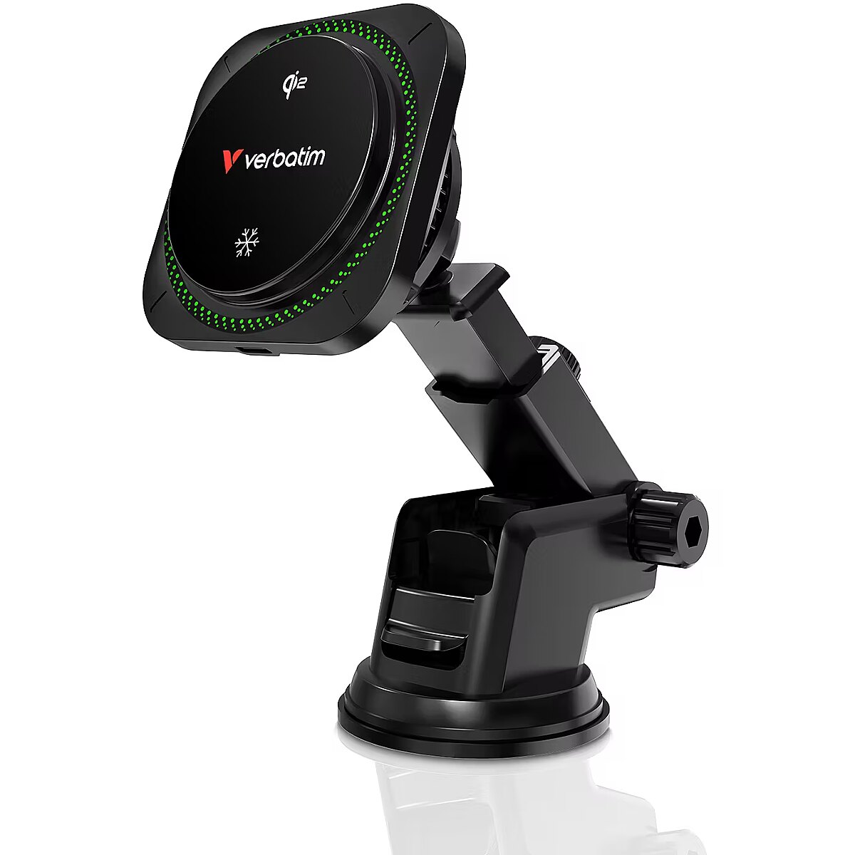 LongDesc - High Power Qi2 Wireless ChargingTake your iPhone charging to the next level with the Verbatim Qi2 Charge ‘n’ Drive “Ice Cooling” Magnetic Wireless Car Charger. Offering up to 15W* of power, it charges iPhone models (16/15/14/13/12) at twice the power of the original Qi standard. Whether you’re navigating or streaming music, your iPhone stays charged and ready. Plus, it supports Qi2-compatible Android devices, ensuring universal compatibility for all your charging needs.The RGB backlight adds style to the setup, making nighttime charging effortless and contributing a vibrant glow to your dashboard, enhancing the overall driving experience.Stay Cool, Charge EfficientlyFeaturing an advanced ice-cooling system, this charger uses a smart cooling fan and semiconductor chilling plate to prevent overheating and ensure optimal charging efficiency. Whether you’re in a hot car or on a long drive, this technology keeps your device cool and charging at maximum speed without interruptions.Flexible Mounting OptionsMount your phone wherever it's most convenient with the charger’s versatile mounting options. Choose from ventilation, dashboard, or windscreen mounting, thanks to the included ventilation holder and suction cup holder. The 360° rotatable design ensures you can always find the perfect viewing angle for navigation, calls, or music control.