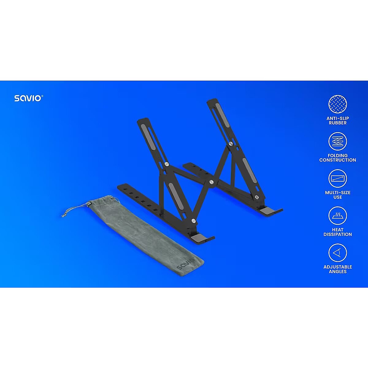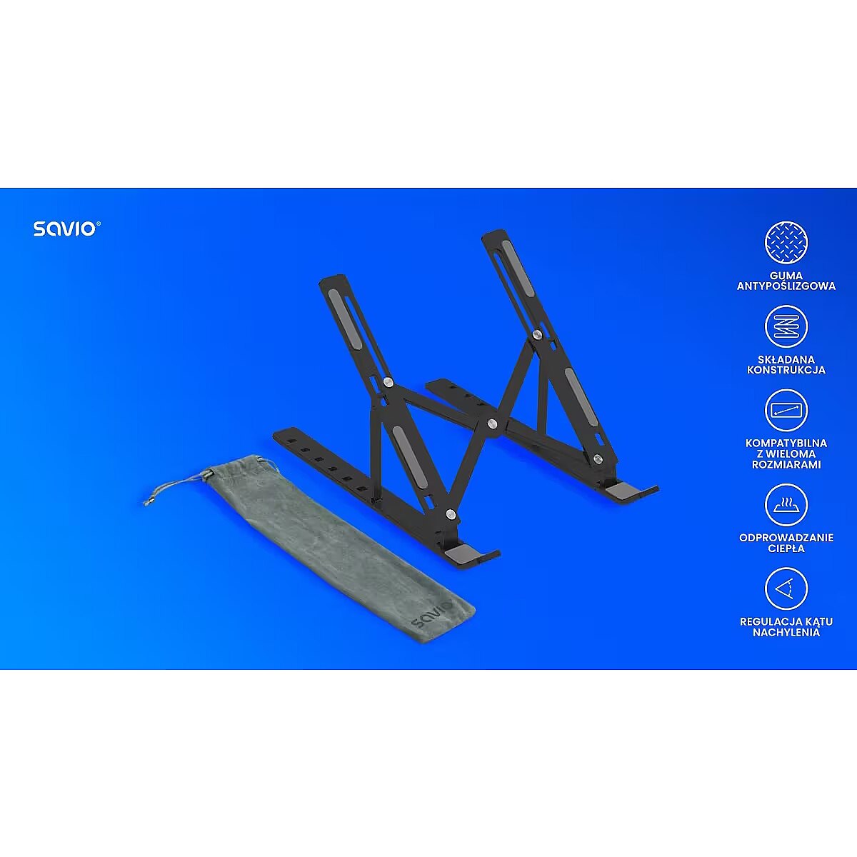 Description - Portable stand for laptop and tablet PB-05 The Savio PB-05 portable laptop and tablet stand was designed with user comfort in mind whether youre at home or on the go. With its 7-step angle adjustment (0°40°), you can easily set the height and angle of your device to match your position. Durable, lightweight, and compact Made from durable aluminum and anti-slip rubber, the PB-05 stand combines strength with portability. Weighing just 245 g, it folds down to fit easily into any bag. Its the perfect choice for those who value mobility without compromising on work comfort. Better ventilation = lower temperature The open design of the stand allows for free airflow, significantly improving your devices ventilation. This helps your laptop or tablet run more stably and protects it from overheating even during intensive use. Universal fit up to 18 inches The Savio PB-05 stand is compatible with devices up to 18 inches in screen size, making it highly versatile. Its stable structure provides reliable support for a wide range of laptops and tablets, regardless of brand.