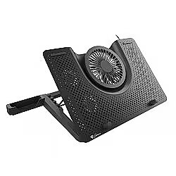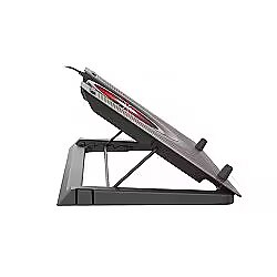 Technical details > Other features - Genesis Oxid 550 is a pad with a large cooling surface made of high-quality aluminum, which additionally enhances heat dissipation. Its construction ensures perfect cooling of both larger laptops up to 17.3” and smaller ones, improving significantly their operation. The cooling system in Genesis Oxid 550 is based on four smaller fans dissipating heat from under the laptop and one large fan providing efficient cooling airflow. With red backlight on each of the fans Genesis Oxid 550 gets a real gaming look. Genesis Oxid 550 provides proper viewing and typing angles with five height adjustment settings for user’s conformity and wrist protection, which can make huge difference during a long gaming fight. The pad is equipped with rubber anti-slip stands to avoid any undesired movement during usage.