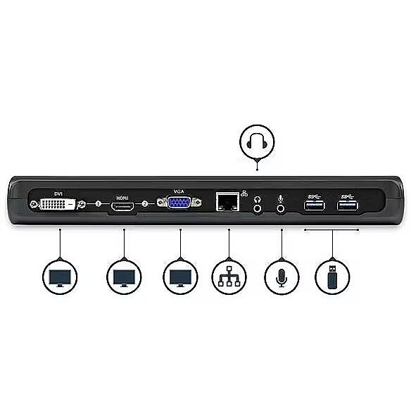 LongDesc - Maximize your productivity with this Dual Monitor USB-A Docking Station featuring Gigabit Ethernet, USB Hub, and AudioThis USB 3.0 dock combines three USB 3.0 ports, headphone and microphone audio connectors, and a Gigabit Ethernet RJ45 port, into a single docking station for maximum productivity.Display AdaptabilityOffering flexible dual video combinations right out-of-the-box, this universal laptop docking station features HDMI, DVI and VGA external monitor outputs. Each video output supports HD video resolutions (2048x1152 max) and HD video playback for an ideal solution to expanding your notebook's video capability.Available display combinations:• HDMI + VGA• HDMI + DVIIntegrated USB HubThe built-in USB hub features three USB 3.0 ports for connecting extra peripherals such as external hard drives or a wired mouse, as if they are connected directly to your laptop.Direct Ethernet ConnectivityThe integrated RJ45 Ethernet port supports speeds of 10/100/1000 Mbps, giving you an instant connection to a wired network.StarTech.com laptop docking stations can be used for cost savings and faster deployment with just a single cable. This USB 3.0 Docking Station is backed by a competitive 3-year warranty and free lifetime Technical Support.The StarTech.com Advantage
