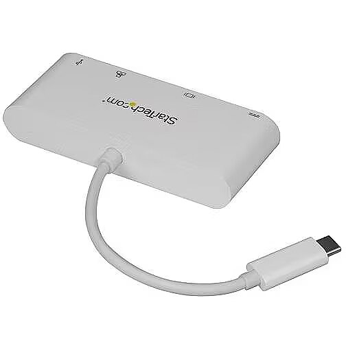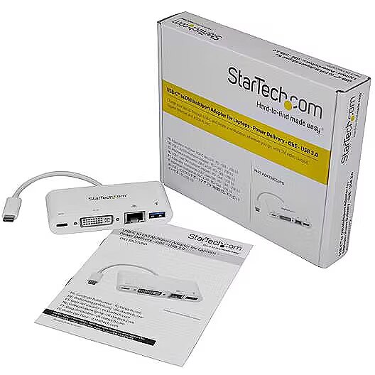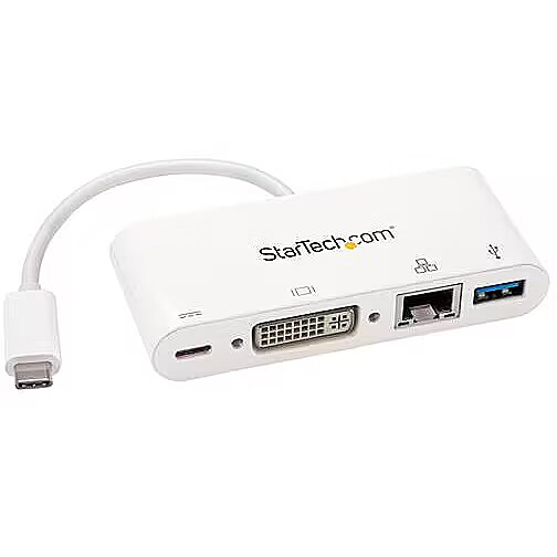 LongSummaryDescription - StarTech.com USB C Multiport Adapter - USB-C to DVI-D (Digital) Video Adapter with 60W Power Delivery Passthrough Charging, GbE, USB-A - Portable USB Type-C/Thunderbolt 3 Mini Laptop Dock. Connectivity technology: Wired, Host interface: USB 3.2 Gen 1 (3.1 Gen 1) Type-C, USB connector type: USB Type-A, USB Type-C. Ethernet LAN data rates: 10,100,1000 Mbit/s, Networking standards: IEEE 802.3, IEEE 802.3ab, IEEE 802.3u. Product colour: White, Data transfer rate: 5000 Gbit/s, Maximum digital resolution: 1920 x 1200 pixels. Power source type: USB, Power supply: 60 W. Windows operating systems supported: Windows 10, Windows 10 Education, Windows 10 Education x64, Windows 10 Enterprise, Windows 10..., Mac operating systems supported: Mac OS X 10.11 El Capitan, Mac OS X 10.12 Sierra, Mac OS X 10.13 High Sierra, Mac OS X 10.14..., Other operating systems supported: ChromeOS