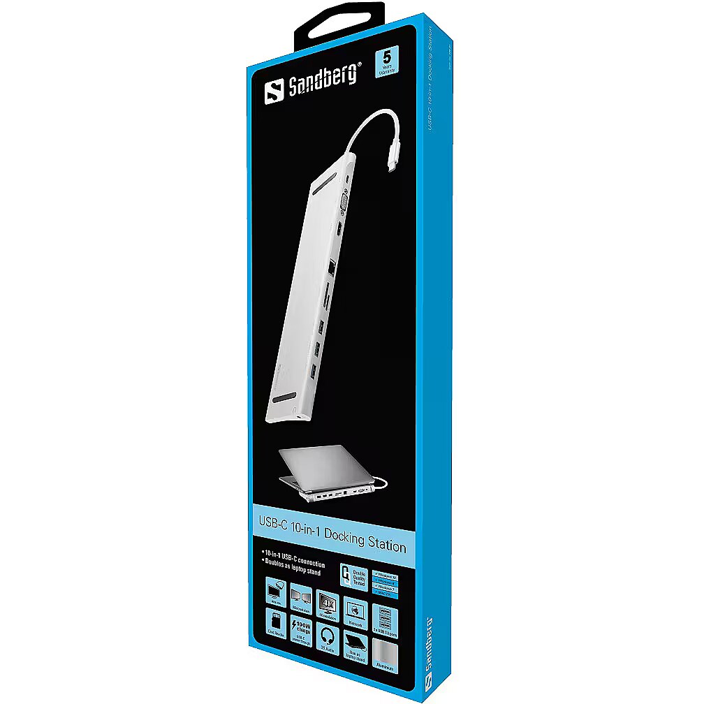 LongDesc - With just one USB-C connection to your laptop Sandberg USB-C 10-in-1 Docking Station gives you the possibility of connecting all your gear:• 3 USB ports for mouse, keyboard and external hard drive, for instance• 2 monitor connectors, respectively HDMI and VGA• Ethernet port for extremely fast Gigabyte network• Audio port for headset and microphone• Card reader for memory card• Power connector for full strength USB-C power supply up to 100WThe docking station is stylishly designed in aluminium and can be used as a practical table stand under your laptop.