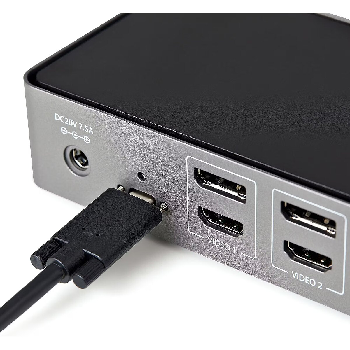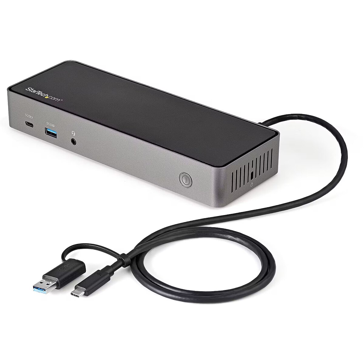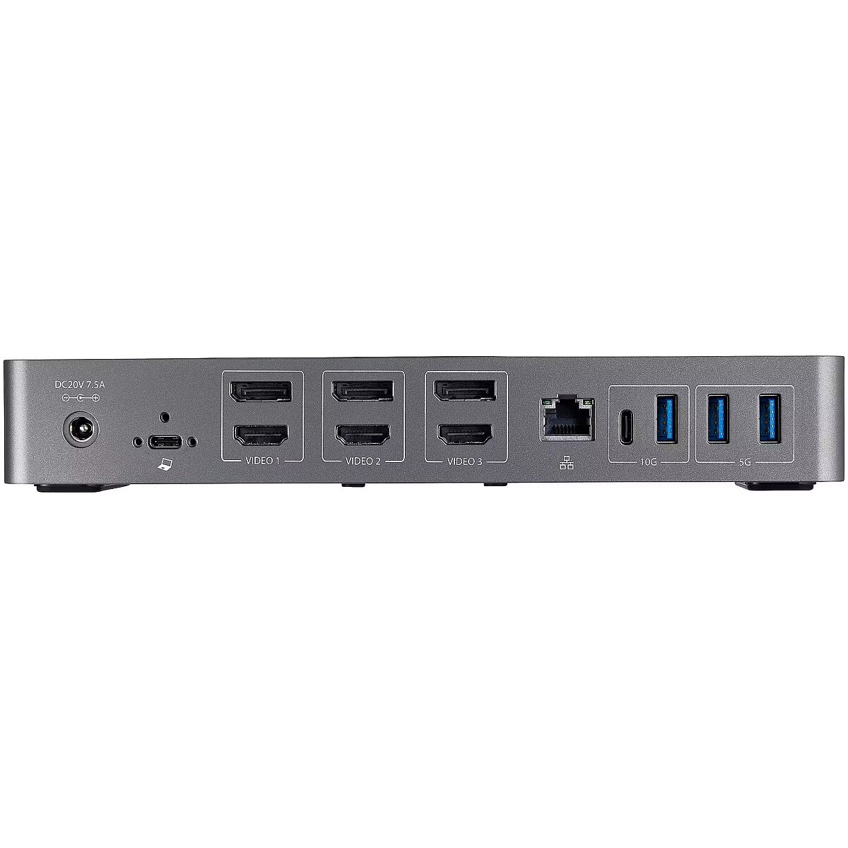 LongDesc - USB-C & USB-A Dock | USB 3.2 Gen 2 10Gbps | 4K 60HZ HDMI | DisplayPort | 85W Power DeliveryThis USB-C Gen 2 10Gbps docking station turns your USB-C ® or Thunderbolt™ 3 MacBook Pro, Windows laptop, and Chromebook into a powerful workstation. A USB 3.2 Gen 2 Type-C dock features everything you need, from triple HDMI or DisplayPort video outputs up to 4K 60 Hz to 10Gbps USB-C & USB-A downstream peripheral ports to 85W Power Delivery. Older USB-A laptops are supported through universal hybrid USB-C/USB-A cable included.HDMI & DisplayPort for Triple Monitor OutputsThis USB-C Gen 2 docking station with DP 1.4 and HDMI 2.0 support, is a perfect choice for dual or triple monitor setup, supporting up to triple 4K 60Hz display output, with any combination of three DisplayPort or HDMI video interfaces, on USB-C Gen 2 (with DP 1.4 support) laptops, MacBooks and Windows-based Thunderbolt 3 laptops. Older USB-A laptops will only support dual monitor setup.HostDisplay OutputUSB-C Gen 1 or 2 (with DP 1.4)Triple Display - 3x 4K 60HzThunderbolt 3 (DP 1.4 Supported)Triple Display - 3x 4K 60HzUSB-C Gen 1 (with DP 1.2)Triple Display - 2x 4K 60Hz; 1x 4K 30HzUSB-A or USB-C (No DP Alt Mode)Dual Display - 2x 4K 60HzPower & Charge with 85W Power DeliveryPower and charge USB-C/Thunderbolt 3 workstation laptops & ultrabooks with 85 watt PDHigher power delivery, MORE than other USB-C 10G Triple monitor docks. Charge smartphones and other devices with two downstream front-facing charging ports with BC 1.2 for USB-A and USB-C devices. Fast-charge ports support always-on charging so devices will charge whether or not a host laptop is connected.Plenty of Downstream USB PortsThis USB-C Gen 2 docking station features 6 downstream USB ports in total to connect USB peripherals.• 1x USB-C 3.2 Gen 2 (10 Gbps)• 1x USB-A 3.2 Gen 2 (10 Gbps)• 1x USB-C 3.2 Gen 1 (5 Gbps)• 3x USB-A 3.2 Gen 1 (5 Gbps)Also included, is a gigabit Ethernet port with PXE Boot and WoL support, as well as 4-position TRRS stereo audio headset/mic port.Additional Security FeaturesThis USB-C/USB-A docking station comes with plenty of security features such as a screw-lock host port which includes a USB-IF Certified 1m 2-in-1 USB-C/USB-A screw-lock cable, and a K-slot for a Kensington style laptop lock.For added security, or flexibility where desk space is limited, this dock can be mounted to the wall, monitor, or underneath the desk with StarTech.com mounting brackets (SSPMSUDWM & SSPMSVESA). These mounting brackets (not included) are specifically designed for our docks and hubs to give you the customized setup you need.Enhance Productivity and Device Management with the StarTech.com Connectivity Tools ApplicationDeveloped to improve performance and security, StarTech.com Connectivity Tools is the only software suite on the market that works with a wide range of IT connectivity accessories. The software suite includes:•Advanced Windows Layout Utility : To setup and save custom windows layouts.•Mac Address Pass-Through Utility : To improve network security.•USB Event Monitoring Utility : To track and log connected USB devices•Wi-Fi Auto Switch Utility : Enabling users to quickly access faster network speeds via wired LAN.For more information and to download the StarTech.com Connectivity Tools application, please visit: www.StarTech.com/Connectivity-ToolsThe StarTech.com Advantage
