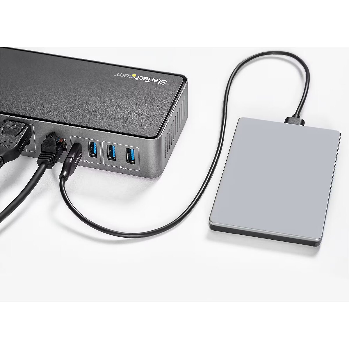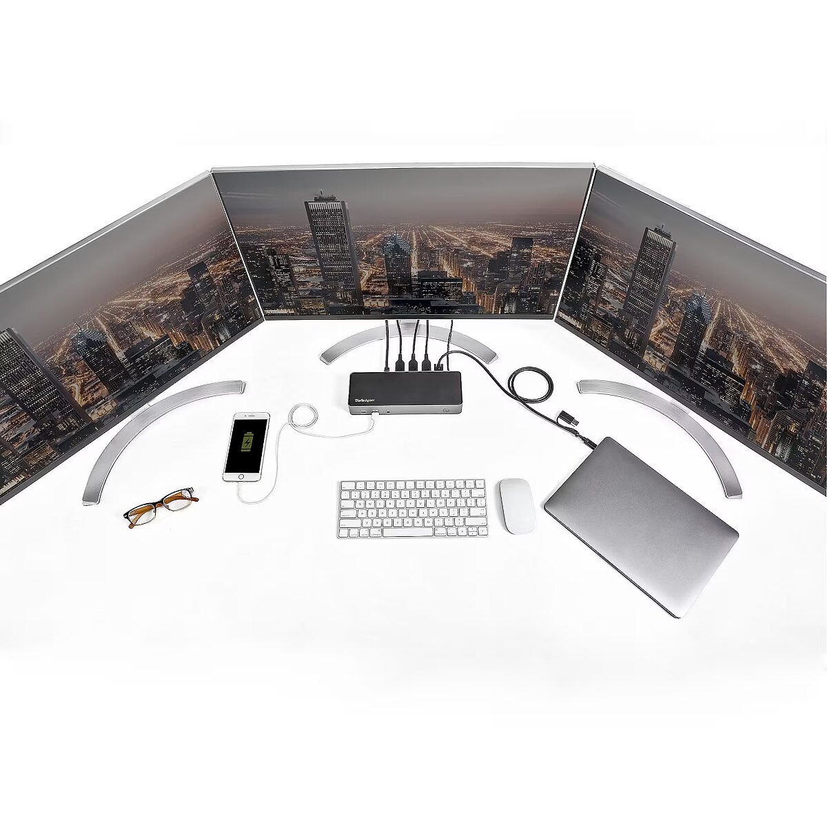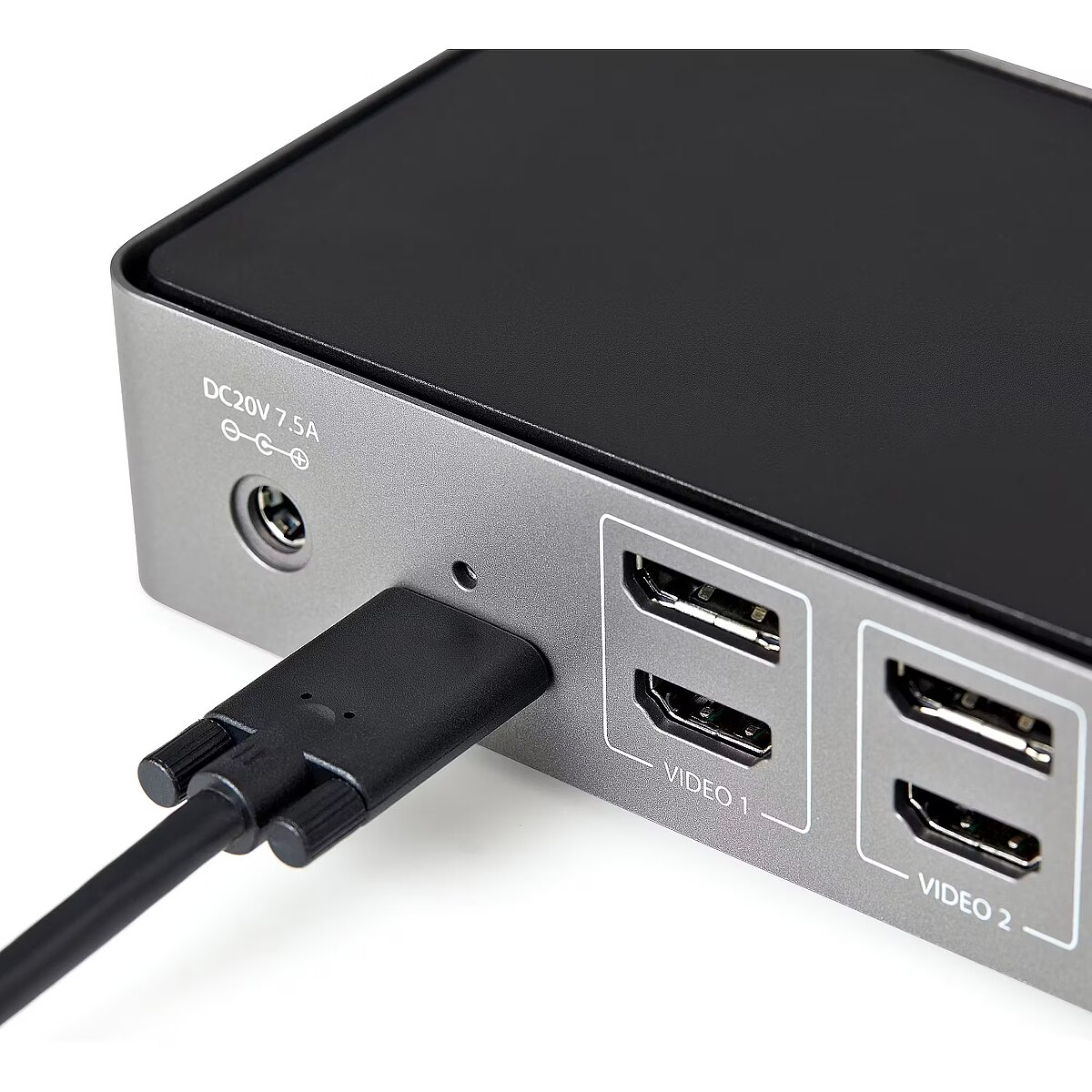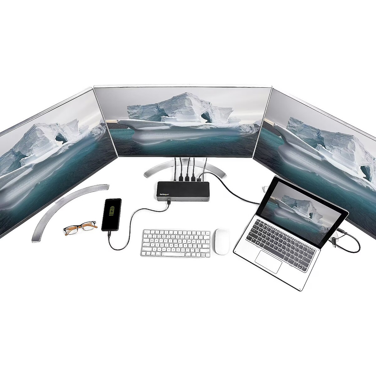 LongDesc - USB-C & USB-A Dock | USB 3.2 Gen 2 10Gbps | 4K 60HZ HDMI | DisplayPort | 85W Power DeliveryThis USB-C Gen 2 10Gbps docking station turns your USB-C ® or Thunderbolt™ 3 MacBook Pro, Windows laptop, and Chromebook into a powerful workstation. A USB 3.2 Gen 2 Type-C dock features everything you need, from triple HDMI or DisplayPort video outputs up to 4K 60 Hz to 10Gbps USB-C & USB-A downstream peripheral ports to 85W Power Delivery. Older USB-A laptops are supported through universal hybrid USB-C/USB-A cable included.HDMI & DisplayPort for Triple Monitor OutputsThis USB-C Gen 2 docking station with DP 1.4 and HDMI 2.0 support, is a perfect choice for dual or triple monitor setup, supporting up to triple 4K 60Hz display output, with any combination of three DisplayPort or HDMI video interfaces, on USB-C Gen 2 (with DP 1.4 support) laptops, MacBooks and Windows-based Thunderbolt 3 laptops. Older USB-A laptops will only support dual monitor setup.HostDisplay OutputUSB-C Gen 1 or 2 (with DP 1.4)Triple Display - 3x 4K 60HzThunderbolt 3 (DP 1.4 Supported)Triple Display - 3x 4K 60HzUSB-C Gen 1 (with DP 1.2)Triple Display - 2x 4K 60Hz; 1x 4K 30HzUSB-A or USB-C (No DP Alt Mode)Dual Display - 2x 4K 60HzPower & Charge with 85W Power DeliveryPower and charge USB-C/Thunderbolt 3 workstation laptops & ultrabooks with 85 watt PDHigher power delivery, MORE than other USB-C 10G Triple monitor docks. Charge smartphones and other devices with two downstream front-facing charging ports with BC 1.2 for USB-A and USB-C devices. Fast-charge ports support always-on charging so devices will charge whether or not a host laptop is connected.Plenty of Downstream USB PortsThis USB-C Gen 2 docking station features 6 downstream USB ports in total to connect USB peripherals.• 1x USB-C 3.2 Gen 2 (10 Gbps)• 1x USB-A 3.2 Gen 2 (10 Gbps)• 1x USB-C 3.2 Gen 1 (5 Gbps)• 3x USB-A 3.2 Gen 1 (5 Gbps)Also included, is a gigabit Ethernet port with PXE Boot and WoL support, as well as 4-position TRRS stereo audio headset/mic port.Additional Security FeaturesThis USB-C/USB-A docking station comes with plenty of security features such as a screw-lock host port which includes a USB-IF Certified 1m 2-in-1 USB-C/USB-A screw-lock cable, and a K-slot for a Kensington style laptop lock.For added security, or flexibility where desk space is limited, this dock can be mounted to the wall, monitor, or underneath the desk with StarTech.com mounting brackets (SSPMSUDWM & SSPMSVESA). These mounting brackets (not included) are specifically designed for our docks and hubs to give you the customized setup you need.Enhance Productivity and Device Management with the StarTech.com Connectivity Tools ApplicationDeveloped to improve performance and security, StarTech.com Connectivity Tools is the only software suite on the market that works with a wide range of IT connectivity accessories. The software suite includes:•Advanced Windows Layout Utility : To setup and save custom windows layouts.•Mac Address Pass-Through Utility : To improve network security.•USB Event Monitoring Utility : To track and log connected USB devices•Wi-Fi Auto Switch Utility : Enabling users to quickly access faster network speeds via wired LAN.For more information and to download the StarTech.com Connectivity Tools application, please visit: www.StarTech.com/Connectivity-ToolsThe StarTech.com Advantage