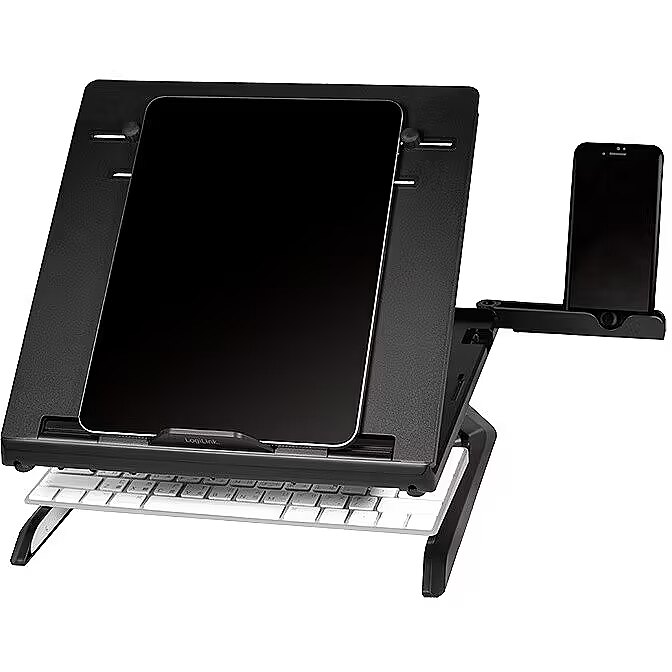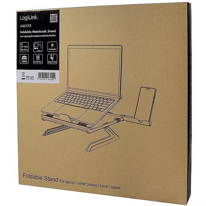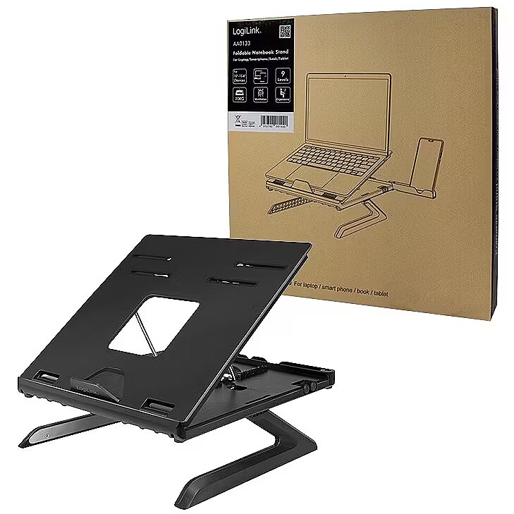 Description - Ergonomic Notebook stand Elevate the screen to eye level for better viewing angle 9 different positions Ventilated design offers increased air circulation Strong and stable for laptops, tablets and smartphones Suitable for 1016" notebooks and tablets Material: metal and plastic Foldable and portable Integrated smartphone holders