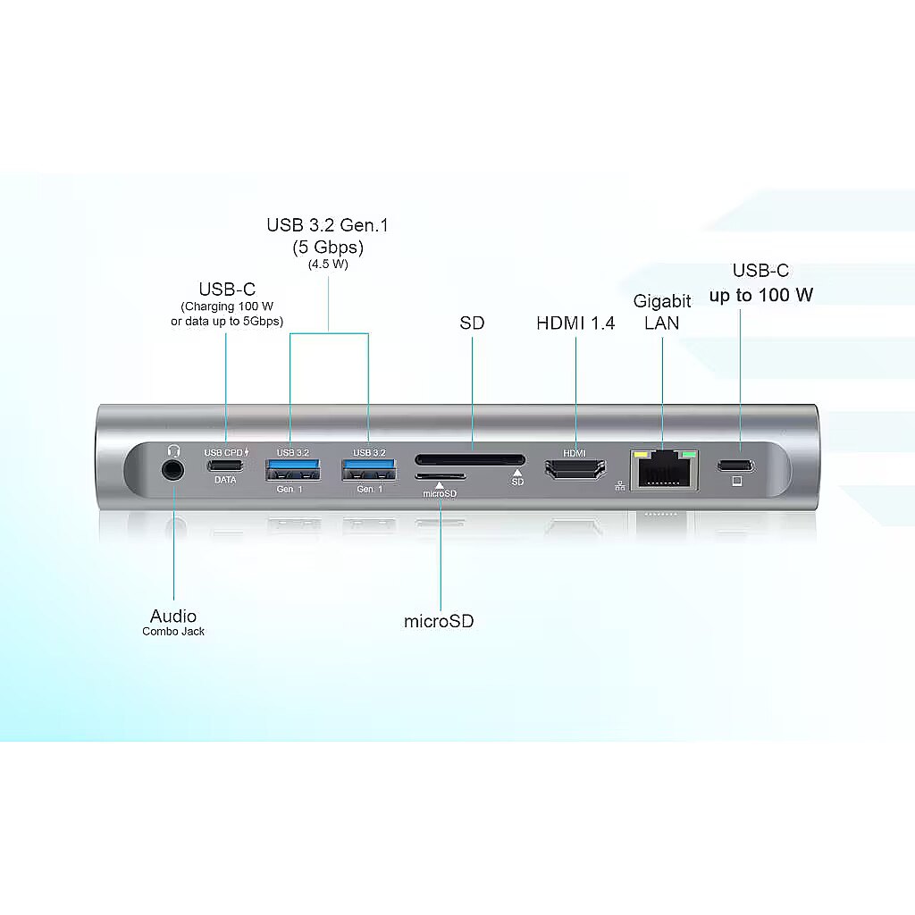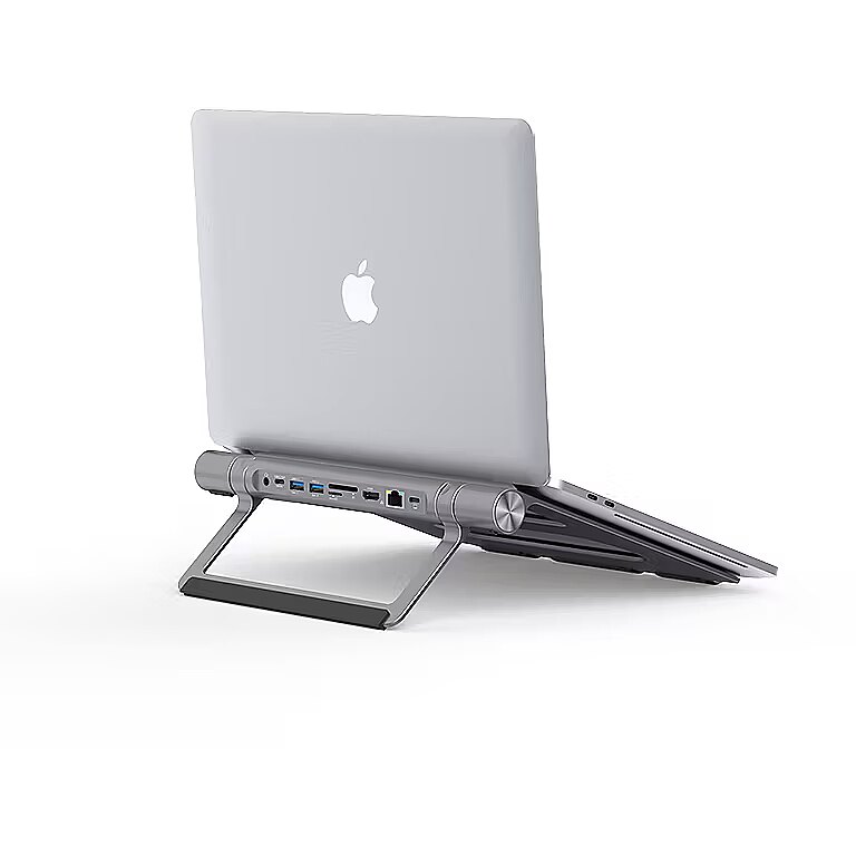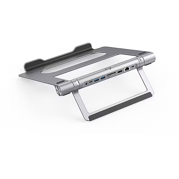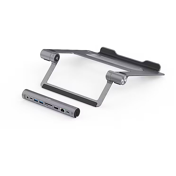 LongDesc - The product kit, which includes a stylish metal stand and USB-C docking station, will make your work more comfortable thanks to the adjustable working height of the laptop, while simplifying the connection to an external monitor, the Internet and peripherals.The stand is designed for laptops up to 3kg and display sizes up to 15.6″ and has been designed for ease of use – the angle of the stand is easy to adjust, but it also allows the stand to be easily transported when folded, so it’s no problem to use it both in the office and at home, for example. The much more efficient passive cooling of the laptop is also a big advantage, which can significantly increase its lifetime.The integrated portable metal docking station is equipped with an HDMI port, 3 USB ports (2x USB-A and one universal USB-C port which can both transfer data and charge the docking station and your laptop via it), a Gigabit LAN adapter, a combined audio/mic port as well as SD/microSD slots, which will especially please photo and video lovers.The dock comes with a 100cm USB-C cable, allowing you to easily and conveniently connect it to your laptop, no matter which side of the laptop the USB-C/Thunderbolt” port is located on.- Connect an external monitor at resolutions up to 4K/30Hz or FHD/120Hz- HDMI port available- Power delivery: up to 100W- 2x USB 3.0 and 1x USB-C with support for charging or data transfer, let you easily connect your USB devices and peripherals. All USB ports support speeds up to 5 Gbps.- Gigabit Ethernet RJ-45 provides a reliable, robust and high-speed Internet connection with support for 10/100/1000 Mbps speeds- Combination audio and microphone jack on the front panel- Supports Windows 10/11, macOS, ChromeOS, iPadOS, Android and Linux- Includes a 100cm USB-C cable