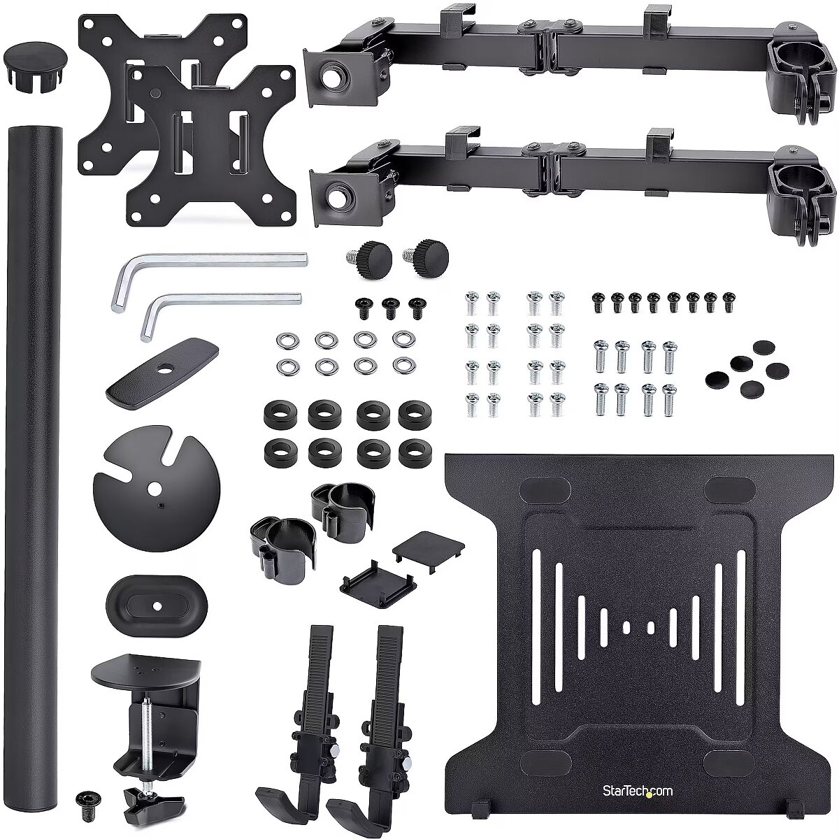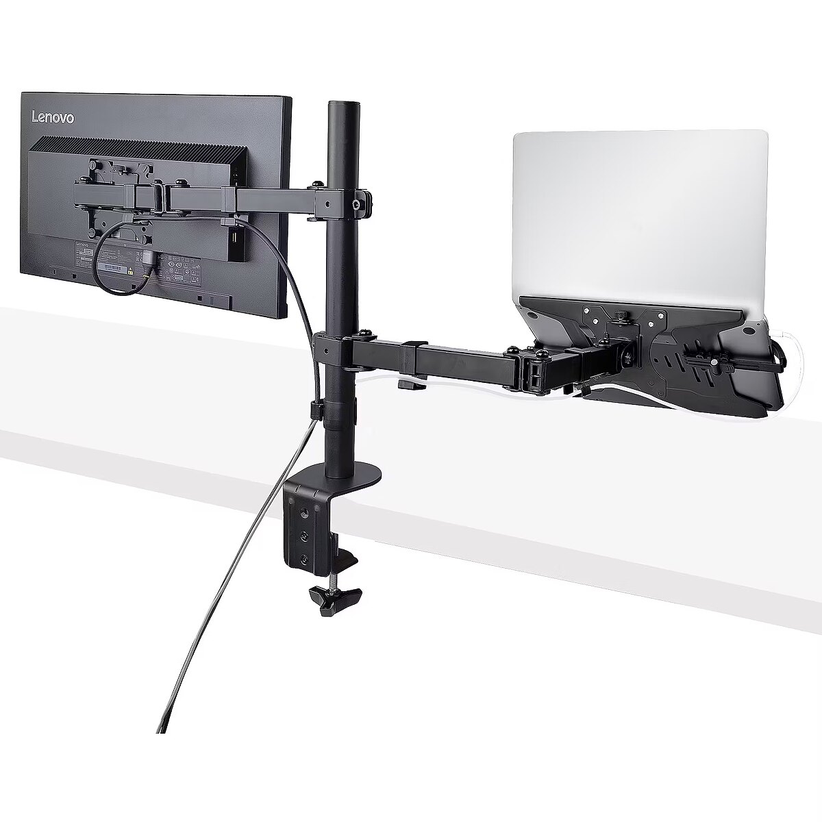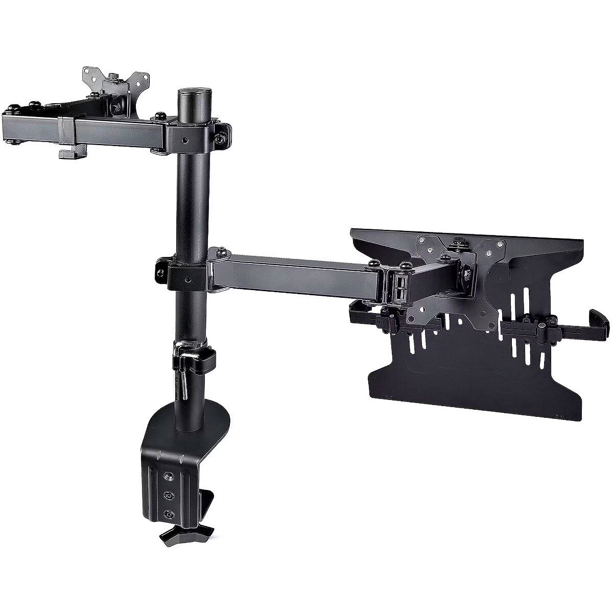 LongDesc - VESA Mount 75x75/100x100 | Laptop up to 9.4" to 16.5" Wide | Heigh AdjustmentIncrease your desk space and add versatility and ergonomics to your work/home setup with this VESA-compatible laptop and monitor desk mount. The laptop tray (11.8x11in / 300x280mm) is large enough to hold a laptop between 9.4-16.5in (240-420mm) wide, 1in (25.4mm) thick, and up to 10lbs (4.5kg). The monitor arm allows you to mount a VESA compatible (75x75mm or 100x100mm) display up to 32in with a maximum weight of 17.6lbs (8kg).Versatile compatibility and solid constructionThis well-ventilated laptop tray includes rubber pads to prevent scuffs and scratches. In addition, the tray features two independent adjustable padded arms that serve as a cradle to secure the laptop and can be independently positioned and secured along the sides of the tray to prevent blocking any port configuration on a laptop. The tray and monitor mount are both solid steel.Wide range of motionThe VESA mounts offer wide adjustability options such as tilt +/-45° swivel +/-90°; and rotation 360°. The height can be adjusted along the 17.4in / 443mm pole and the arms can also extend out a maximum of 15.7in / 399mm out. Two joints (at the pole and middle of the arms) allow them to swivel +/-180°.Ergonomic designThe multiple adjustment options allow the laptop to be positioned at eye level improving your posture and comfort, and when positioning the monitor mount beside it, enhances your screen real estate and productivity.Mounting optionsUsing the interchangeable desk clamp (C-clamp) you can easily attach and secure the mount to a desk or grommet hole by hand (grommet hole 0.39-2.36in / 10-60mm and desks 0.39-3.46in / 10-88mm thick). You can remove the laptop tray or monitor with no tools for hassle-free changes in your setup. To keep everything neatly arranged, cable management clips around the support arms keep the cables organized and out of the way.A2-LAPTOP-DESK-MOUNT is backed for 5-years by StarTech.com, including free lifetime 24/5 multi-lingual technical assistance.The StarTech.com Advantage