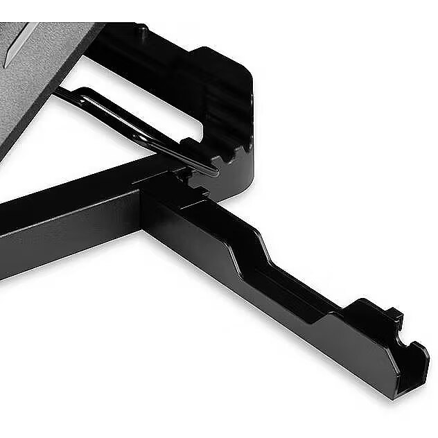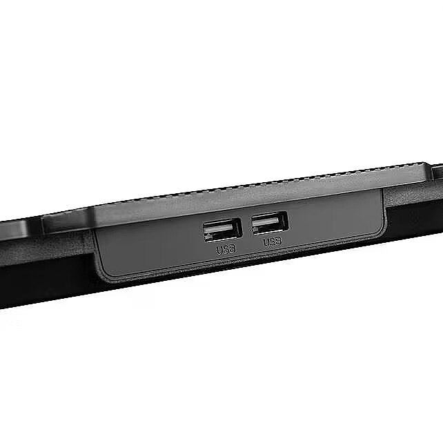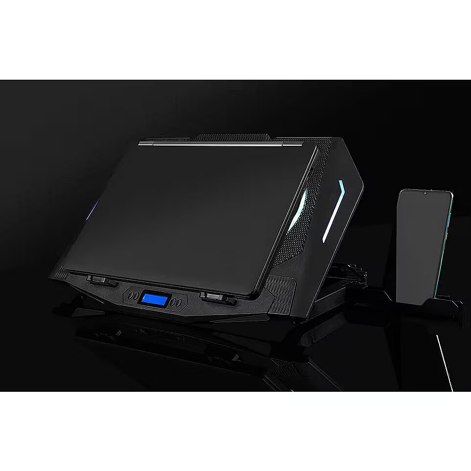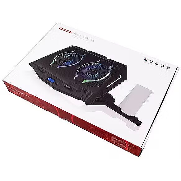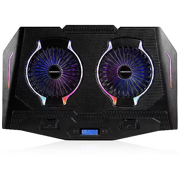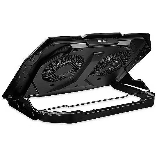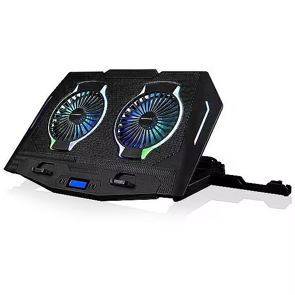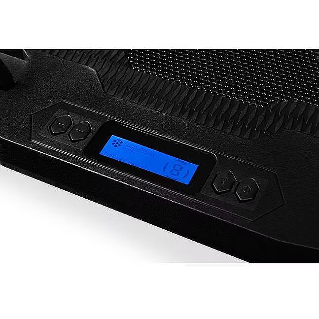 Description - Two high-performance fans The stand is equipped with two 120 mm high-performance fans with RGB illumination. They not only cool effectively, but also provide a striking visual impression.  Materials The stand is equipped with a metal mesh that securely supports the laptop. The rest of the construction is made of lightweight yet durable plastic.  Control panel The control panel with LCD display makes it possible to control the speed of the fans. They can also be switched off from the panel. One button is used to change the backlighting mode.