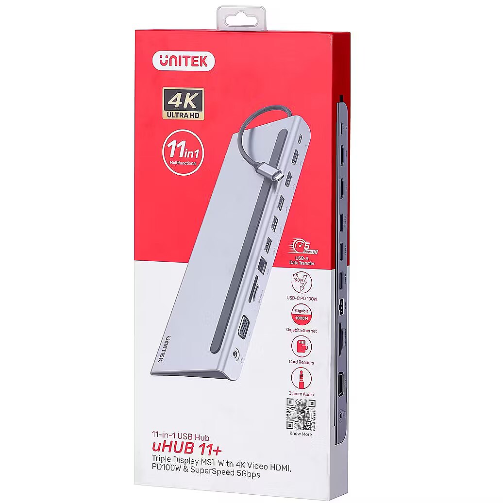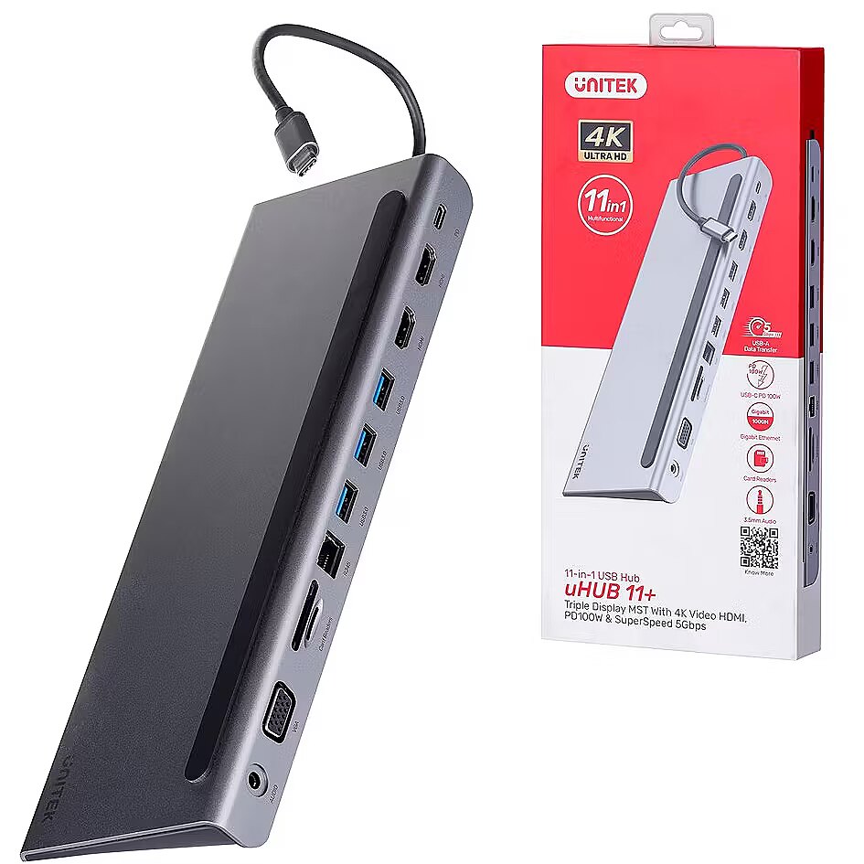 Description - Nowe możliwości Stacja dokująca znacznie zwiększa możliwości, umożliwiając podłączenie aż do 11 dodatkowych urządzeń. Dzięki zróżnicowanym portom sprosta wymaganiom Twojego stanowiska pracy oraz rozrywki. Wystarczy podłączyć ją klasycznym przewodem USB-C. Porty, które zawiera stacja dokująca to: 3x USB-A (do 5Gbps) 2x HDMI (do 4K 30Hz) 1 x VGA 1x USB-C z Power Delivery (ładowanie 100W) 1x czytnik kart SD 1x czytnik kart microSD 1x RJ45 Ethernet 1x 3.5mm jack audio Trzy ekrany Stacja dokująca oferuje możliwość wyświetlania na trzech ekranach jednocześnie poprzez dwa złącza HDMI oraz VGA, dzięki któremu możesz podłączyć rzutnik. W ten sposób nie tylko stworzysz prywatne kino, ale i zapewnisz dodatkową atrakcję dla odwiedzających Cię znajomych, zapraszając ich do wspólnej rozgrywki w ulubioną grę. Szybkie ładowanie Stacja jest wyposażona w technologię Power Delivery o mocy 100W, co oznacza, że można wydajnie ładować komputer przewodem podłączonym do portu USB C. Nawet jeśli masz tylko jeden port USB-C w ultrabooku, nie musisz iść na kompromisy i decydować co jest ważniejsze. Lepsza ergonomia Wykorzystanie aluminium w obudowie urządzenia pozwala na skuteczne odprowadzanie ciepła. Dzięki temu masz pewność, że nawet korzystając ze wszystkich portów jednocześnie, Twoim urządzeniom nie grozi przegrzanie. Projekt urządzenia sprawia, że można również użyć go jako podstawki pod laptopa, zwiększając ergonomię stanowiska pracy. Jakość gwarantowana Unitek jest pewien jakości swoich produktów, dlatego wszystkie urządzenia w Polsce są objęte dożywotnią gwarancją dystrybutora. Oznacza to, że w przypadku ewentualnych problemów technicznych, możesz odesłać sprzęt do serwisu za pomocą pobliskiego paczkomatu. Odwiedź lokalną stronę marki Unitek, żeby dowiedzieć się więcej lub uzyskać pomoc techniczną. Dostępne porty: 3x USB-A (do 5Gbps) 2x HDMI (do 4K 30Hz) 1 x VGA 1x USB-C z Power Delivery (ładowanie 100W) 1x czytnik kart SD 1x czytnik kart microSD 1x RJ45 Ethernet 1x 3.5mm jack audio