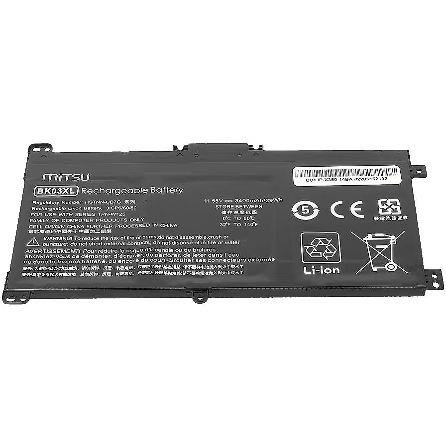 Description - Mitsu Battery for HP Pavilion X360 14-BA 3400 mAh (39 Wh) 11.55 Volt - 5BM742 Model BC/HP-X360-14BA High quality at a reasonable price, safety and ecology are the features of MITSU batteries that have already been appreciated by thousands of Europeans, mainly in Poland, the Czech Republic and Slovakia. It is the result of combining the best components with attention to every stage of the production process, supported by constant quality control, as well as an emphasis on device safety. Mitsu is: High-end, proven, ecological class A lithium-ion cells Actual declared capacity Much slower decline in nominal capacity compared to other cheaper alternatives Low susceptibility to spontaneous discharge No memory effect Factory protections against overcharge and deep discharge, as well as against overvoltage OVP, overheating OTP, SCP short circuit and OCP current overload Reliable and long-lasting time between recharges 6-step quality control. By buying this laptop battery, you can also be sure that you care for the environment at the same time. The manufacturer closely cooperates with organizations dealing with broadly understood environmental education, supporting selective collection and maximum recovery of waste. MITSU batteries are CE, ROHS and ISO9001 certified products. Replaces batteries: 916366-421, 916366-541, 916366541, 916811-855, BK03XL, BKO3XL, HSTNN-LB7S, HSTNN-UB7G, TPN-W125, Model BC/HP-X360-14BA Fits: HP Pavilion series X360 14-BA, X360 14-BA000, X360 14-BA000NA, X360 14-BA000NB, X360 14-BA000NF, X360 14-BA000NL, X360 14-BA000UR, X360 14-BA001LA, X360 14-BA001NB, X360 14-BA001NF, X360 14-BA001NI, X360 14-BA001NIA, X360 14-BA001NJ, X360 14-BA001NK, X360 14-BA001NL, X360 14-BA001NS, X360 14-BA001NT, X360 14-BA001NX, X360 14-BA001TU, X360 14-BA001TX, X360 14-BA002LA, X360 14-BA002NE, X360 14-BA002NI, X360 14-BA002NIA, X360 14-BA002NK, X360 14-BA002NO, X360 14-BA002NP, X360 14-BA002NQ, X360 14-BA002NS, X360 14-BA002NX, X360 14-BA002TU, X360 14-BA002TX, X360 14-BA003LA, X360 14-BA003NF, X360 14-BA003NI, X360 14-BA003NIA, X360 14-BA003NK, X360 14-BA003NL, X360 14-BA003NQ, X360 14-BA003NT, X360 14-BA003NU, X360 14-BA003NX, X360 14-BA003TU, X360 14-BA003TX, X360 14-BA004LA, X360 14-BA004NB, X360 14-BA004NE, X360 14-BA004NI, X360 14-BA004NL, X360 14-BA004NM, X360 14-BA004NP, X360 14-BA004NS, X360 14-BA004NT, X360 14-BA004NX, X360 14-BA004TU, X360 14-BA004TX, X360 14-BA005LA, X360 14-BA005NC, X360 14-BA005NE, X360 14-BA005NF, X360 14-BA005NI, X360 14-BA005NM, X360 14-BA005NT, X360 14-BA005NV, X360 14-BA005NW, X360 14-BA005NX, X360 14-BA005TU, X360 14-BA005TX, X360 14-BA006LA, X360 14-BA006NF, X360 14-BA006NG, X360 14-BA006NM, X360 14-BA006NO, X360 14-BA006NQ, X360 14-BA006NS, X360 14-BA006NT, X360 14-BA006NV, X360 14-BA006NX, X360 14-BA006TU, X360 14-BA006TX, X360 14-BA007CA, X360 14-BA007NA, X360 14-BA007NB, X360 14-BA007NE, X360 14-BA007NX, X360 14-BA007TU, X360 14-BA007TX, X360 14-BA008LA, X360 14-BA008NA, X360 14-BA008NB, X360 14-BA008NE, X360 14-BA008NF, X360 14-BA008NK, X360 14-BA008NL, X360 14-BA008NM, X360 14-BA008NX, X360 14-BA008TU, X360 14-BA008TX, X360 14-BA009LA, X360 14-BA009NE, X360 14-BA009NF, X360 14-BA009NK, X360 14-BA009NM, X360 14-BA009NO, X360 14-BA009NS, X360 14-BA009NX, X360 14-BA009TU, X360 14-BA009TX, X360 14-BA010CA, X360 14-BA010LA, X360 14-BA010NB, X360 14-BA010NC, X360 14-BA010ND, X360 14-BA010NF, X360 14-BA010NM, X360 14-BA010NO, X360 14-BA010NS, X360 14-BA010NU, X360 14-BA010NX, X360 14-BA010TU, X360 14-BA010TX, X360 14-BA011NC, X360 14-BA011NG, X360 14-BA011NJ, X360 14-BA011NM, X360 14-BA011NO, X360 14-BA011NS, X360 14-BA011NU, X360 14-BA011NW, X360 14-BA011NX, X360 14-BA011TU, X360 14-BA011TX, X360 14-BA011UR, X360 14-BA012ND, X360 14-BA012NF, X360 14-BA012NG, X360 14-BA012NJ, X360 14-BA012NL, X360 14-BA012NM, X360 14-BA012NO, X360 14-BA012NX, X360 14-BA012TU, X360 14-BA012TX, X360 14-BA013CA, X360 14-BA013NF, X360 14-BA013NG, X360 14-BA013NL, X360 14-BA013NM, X360 14-BA013NX, X360 14-BA013TU, X360 14-BA013TX, X360 14-BA013UR, X360 14-BA014NH, X360 14-BA014NL, X360 14-BA014NM, X360 14-BA014NX, X360 14-BA014TU, X360 14-BA014TX, X360 14-BA014UR, X360 14-BA015NF, X360 14-BA015NG, X360 14-BA015NH, X360 14-BA015NL, X360 14-BA015NM, X360 14-BA015NW, X360 14-BA015NX, X360 14-BA015TU, X360 14-BA015TX, X360 14-BA015UR, X360 14-BA016NA, X360 14-BA016NF, X360 14-BA016NH, X360 14-BA016NL, X360 14-BA016NM, X360 14-BA016NO, X360 14-BA016NW, X360 14-BA016NX, X360 14-BA016TU, X360 14-BA016TX, X360 14-BA016UR, X360 14-BA017NB, X360 14-BA017NF, X360 14-BA017NG, X360 14-BA017NW, X360 14-BA017TU, X360 14-BA017TX, X360 14-BA017UR, X360 14-BA018CA, X360 14-BA018NG, X360 14-BA018NL, X360 14-BA018NW, X360 14-BA018TU, X360 14-BA018TX, X360 14-BA018UR, X360 14-BA019NB, X360 14-BA019NF, X360 14-BA019NG, X360 14-BA019NH, X360 14-BA019NL, X360 14-BA019TU, X360 14-BA019TX, X360 14-BA019UR, X360 14-BA020NA, X360 14-BA020NB, X360 14-BA020NF, X360 14-BA020NG, X360 14-BA020NL, X360 14-BA020NP, X360 14-BA020NW, X360 14-BA020TU, X360 14-BA020TX, X360 14-BA020UR, X360 14-BA021NB, X360 14-BA021NG, X360 14-BA021NL, X360 14-BA021TU, X360 14-BA021TX, X360 14-BA021UR, X360 14-BA022ND, X360 14-BA022NF, X360 14-BA022NP, X360 14-BA022NW, X360 14-BA022TU, X360 14-BA022TX, X360 14-BA022UR, X360 14-BA023NB, X360 14-BA023NF, X360 14-BA023NL, X360 14-BA023NW, X360 14-BA023TU, X360 14-BA023TX, X360 14-BA023UR, X360 14-BA024NF, X360 14-BA024NL, X360 14-BA024NP, X360 14-BA024NS, X360 14-BA024NW, X360 14-BA024TU, X360 14-BA024TX, X360 14-BA025ND, X360 14-BA025NF, X360 14-BA025NL, X360 14-BA025NS, X360 14-BA025TU, X360 14-BA025TX, X360 14-BA025UR, X360 14-BA026ND, X360 14-BA026NF, X360 14-BA026NG, X360 14-BA026NL, X360 14-BA026NP, X360 14-BA026NS, X360 14-BA026TU, X360 14-BA026TX, X360 14-BA027NG, X360 14-BA027NS, X360 14-BA027TU, X360 14-BA027TX, X360 14-BA028NG, X360 14-BA028NP, X360 14-BA028NS, X360 14-BA028TU, X360 14-BA028TX, X360 14-BA029NP, X360 14-BA029NS, X360 14-BA029TU, X360 14-BA029TX