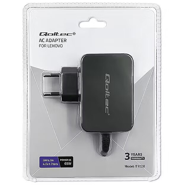 Reliability is crucial for you? Choose the Qoltec 65W AC adapter dedicated to Lenovo laptops. It will be ideal for use at home or in the office. It was made of the highest quality materials, and the technologies used in it will allow low power consumption and high efficiency. In addition, our power supply is characterized by high stability. In the set you will find a power supply for Lenovo 65W with a 4.0*1.7 plug, as well as a Velcro for organizing the cable, thanks to which you can adjust the length of the cable to your needs.