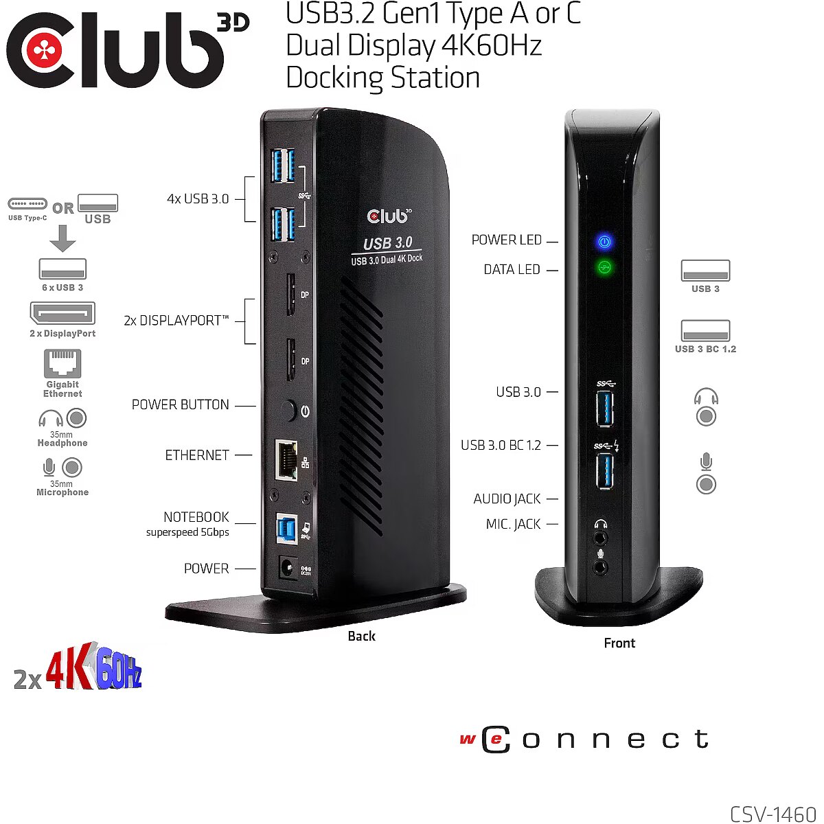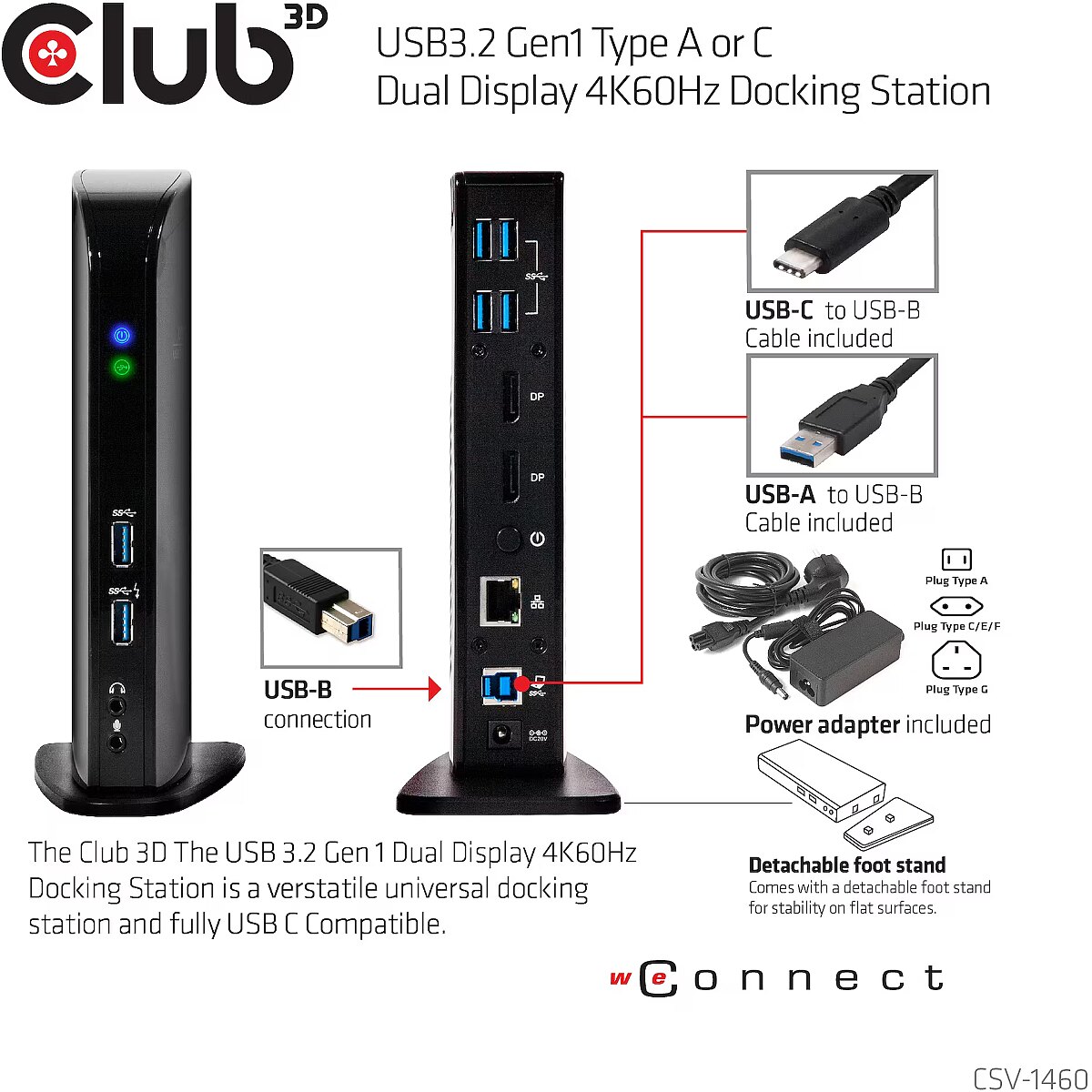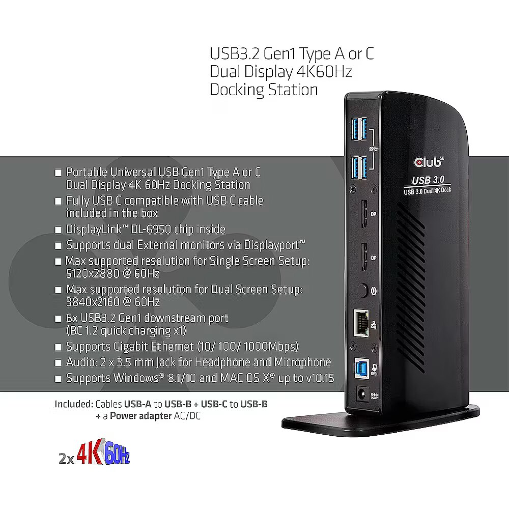 Description - USB3.2 Gen1 Type A or C Dual Display 4K60Hz Docking Station The Club 3D CSV-1460 USB3.2 Gen1 Type A or C Dual Display 4K 60Hz Docking Station is designed to satisfy all your connectivity demands. It provides no less than 6 USB3.2 Gen1 Ports, Headphone- and Microphone- connection, Gigabit Ethernet port and 2 x Displayport™4K60Hz outputs.It is fully USB C compatible and a USB3.2 Gen1 Type C to USB3.2 Gen1 type B cable is included in the box. With this CSV-1460 you can now connect two screens at 3 840x2160 UHD at 60Hz resolution to almost all existing Notebooks or Tablets just by using a single USB3.2 Gen1 Type A or C port! Featuring the advanced DisplayLink™ DL-6950 chip, you can even connect one screen at a resolution of 5K at 60Hz! The USB3.2 Gen1 Type A or C Dual Display Docking Station has a convenient design and detachable stand, allowing it to be placed on your desk in horizontal- or vertical position. It's a productivity enhancing tool for any power user working in a (semi) professional environment. Dual Mode DisplayPort™: The USB3.2 Gen1 Type A or C Dual Display 4K 60Hz Docking Station has 2 Displayport™++ outputs or in other words, Displayport™ 1.2 Dual Mode. This means that for the conversion of the video signal to DVI or HDMI™ passive cables or adapters must be used.