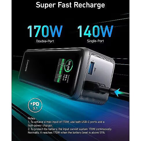 Description - 250W fast multi-device charging: Featuring the latest PD 3.1 technology, the power bank comes with 2 USB-C ports and 1 USB-A port that delivers up to 250W of power. Boost the performance of your MacBook Pro 16" (M2 Pro) up to 50% in just 28 minutes. Intuitive Smart App: Use the Anker app to quickly locate your power bank with audio alerts, access real-time stats, and optimize your device's battery life with smart charging. Small size, huge power: The power bank is the size of a soda can with a capacity of 27,650 mAh and can charge a 13-inch MacBook Air (M2) 1.28 times or an iPhone 14 about 4.67 times. Please note that this power bank has a capacity of 99.54 Wh, which meets the TSA requirements (above 100 Wh) to be taken on a plane as hand luggage. 170W Fast Charging via USB-C: Charge your power bank at lightning speed with convenient dual USB-C ports, so you can fully charge it in just 37 minutes. What you get: Anker Prime 27,650mAh (250W) Power Bank, 2ft/0.6m 140W USB-C to USB-C Charging Cable, Travel Case, Quick Start Guide, Our Hassle-Free 24-Month Warranty and friendly customer service.
