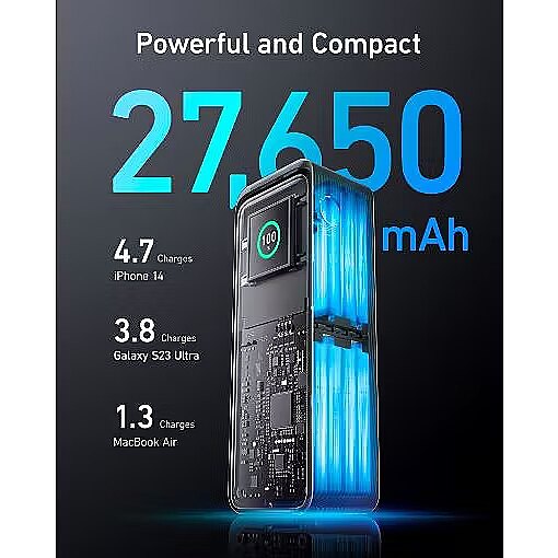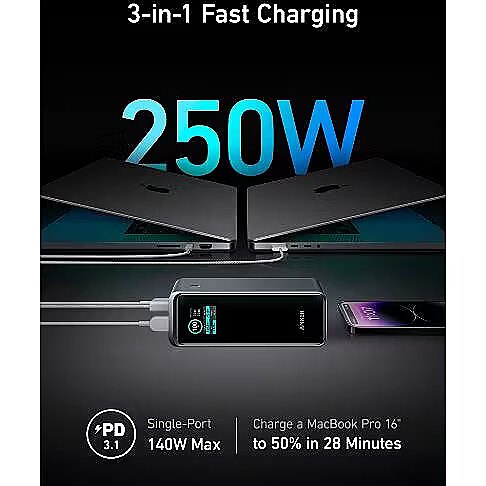 LongDesc - - 250W Multi-Device Fast Charging: Powered by the latest PD 3.1 technology, the power bank comes with 2 USB-C ports and 1 USB-A port to deliver up to 250W of power. Boost your MacBook Pro 16" (M2 Pro) to 50% in just 28 minutes.- Intuitive Smart App: Use the Anker app to quickly locate your power bank with sound alerts, access real-time stats, and optimize device battery life with smart charging.- Small Size, Huge Power: The power bank is the size of a soda can with a capacity of 27,650mAh and can charge a 13-inch MacBook Air (M2) 1.28 times or an iPhone 14 approximately 4.67 times. Please know that this power bank is 99.54Wh, which meets the requirements of the TSA(LongProductName - Prime 27650mAh