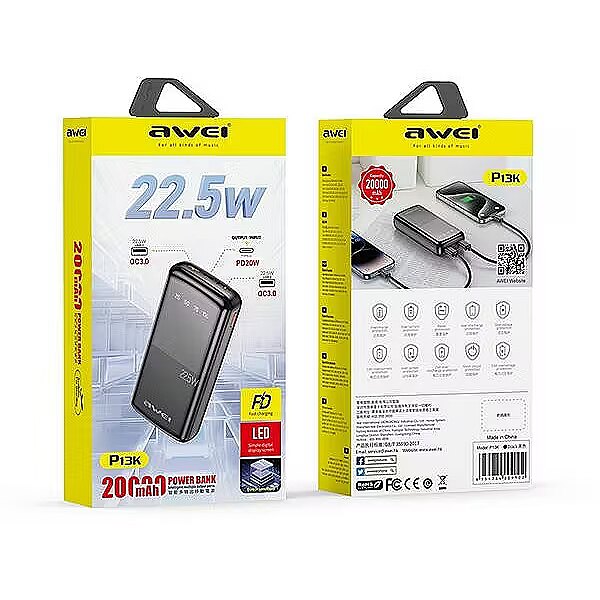 Other features - Technical data Mark AWEI Model P13K Type Power Bank Battery capacity 20000mAh Battery charge indicator Yes Dimensions 146 x 69.3 x 28.5mm Type-C Input 12V 1.5A 9V 2A 5V 2.5A Type-C Output 12V 1.67A 9V 2.22A 5V 3A USB output 12V 1.5A 9V 2A 5V 3A 10V 2.25A Battery core Polymer Material ABS+PC fireproof Color Black